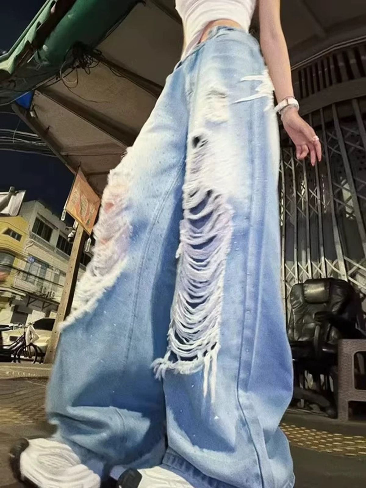 아메리칸 레트로 워싱 찢어진 부분 청바지 여성 새로운 로우 웨이스트 고급 루즈핏 넓은 다리 바나나 바지