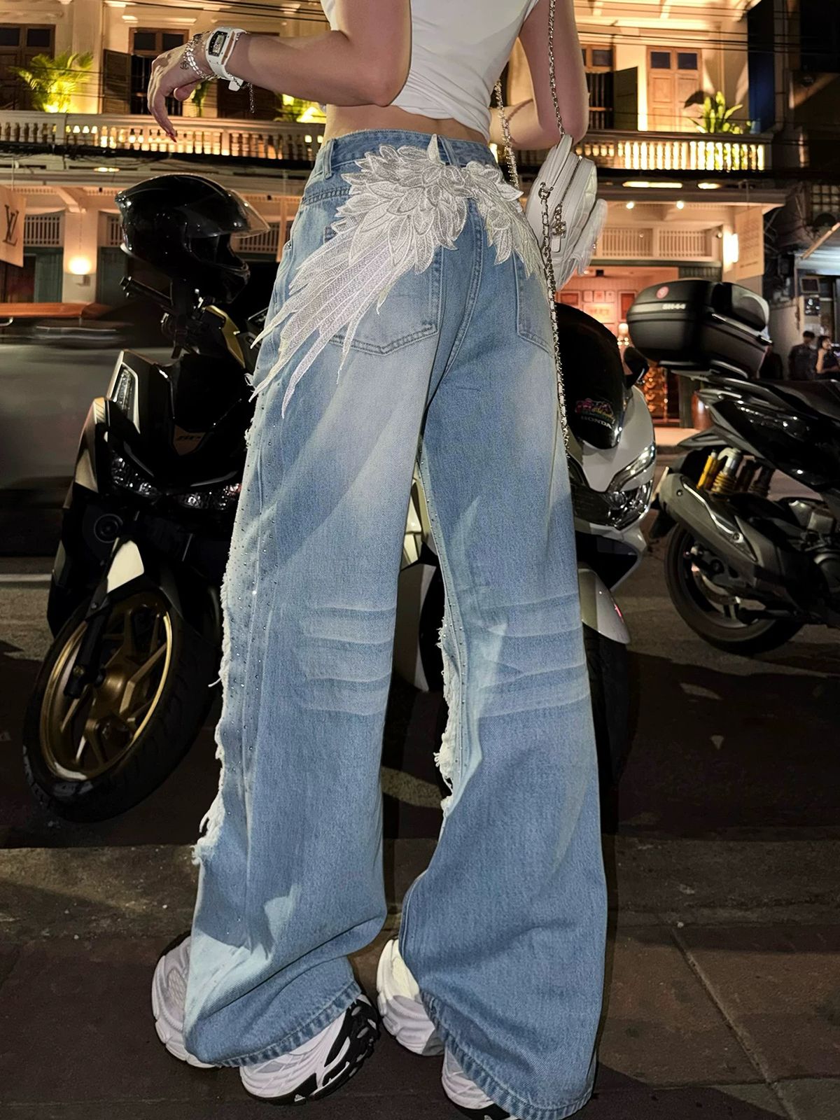 아메리칸 루즈핏 느긋한 느슨함 센스 청바지 아이들 여름 새로운 핫걸 마 오래된 워싱 찢어진 부분 바닥 청소 긴 바지