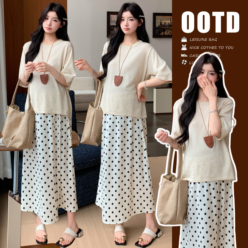 실사 임산부 여름 드레스 새로운 아마 니트 대 에디션 루즈핏 티셔츠 도트 무늬 반 스커트 세트