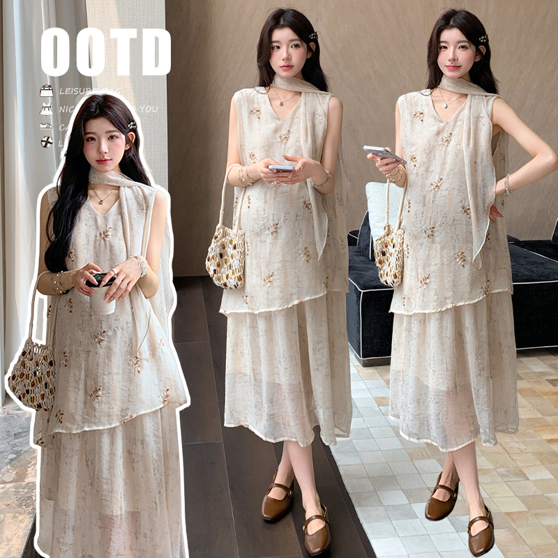 실사 2026 년 여름 임산부 새로운 패션 미니멀리즘 다용도 프릴 슬립 플러스 롱 코트 셔츠 세트