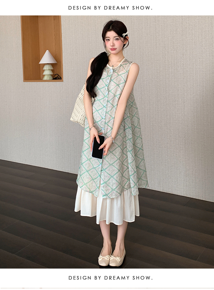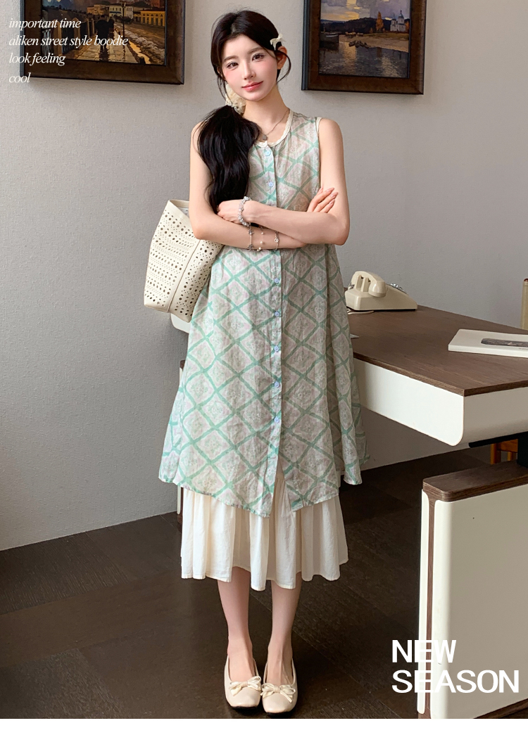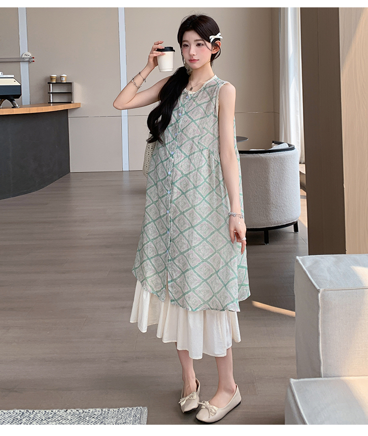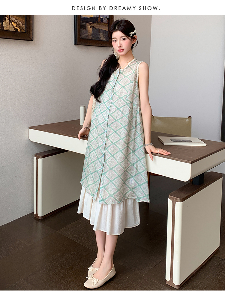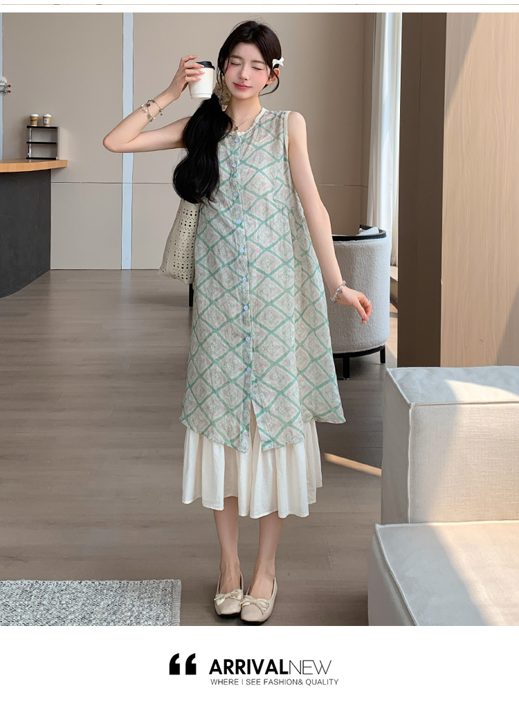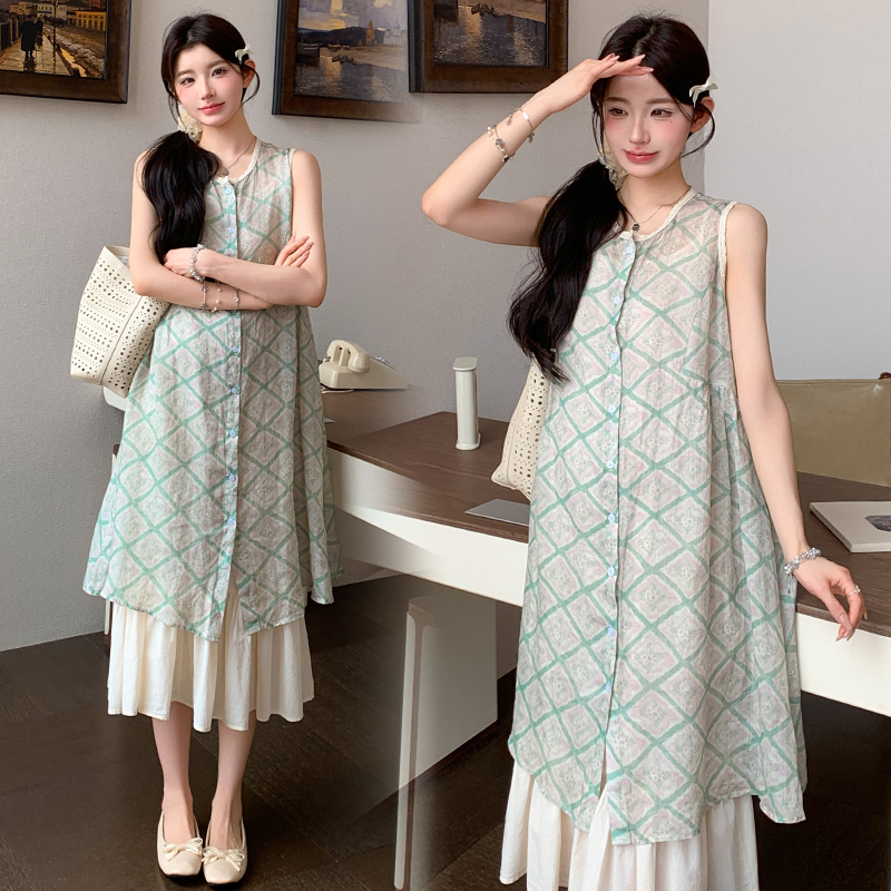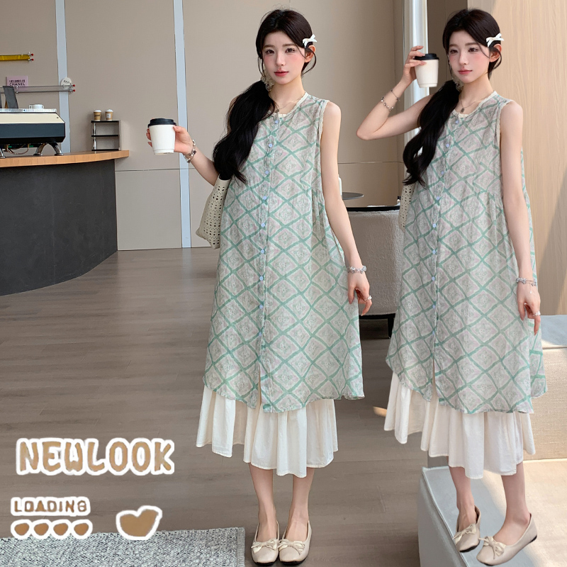 실사 지금 지금 임산부 새로운 루즈핏 녹색 체크무늬 조끼 스커트 대 치마 슬립 치마 세트