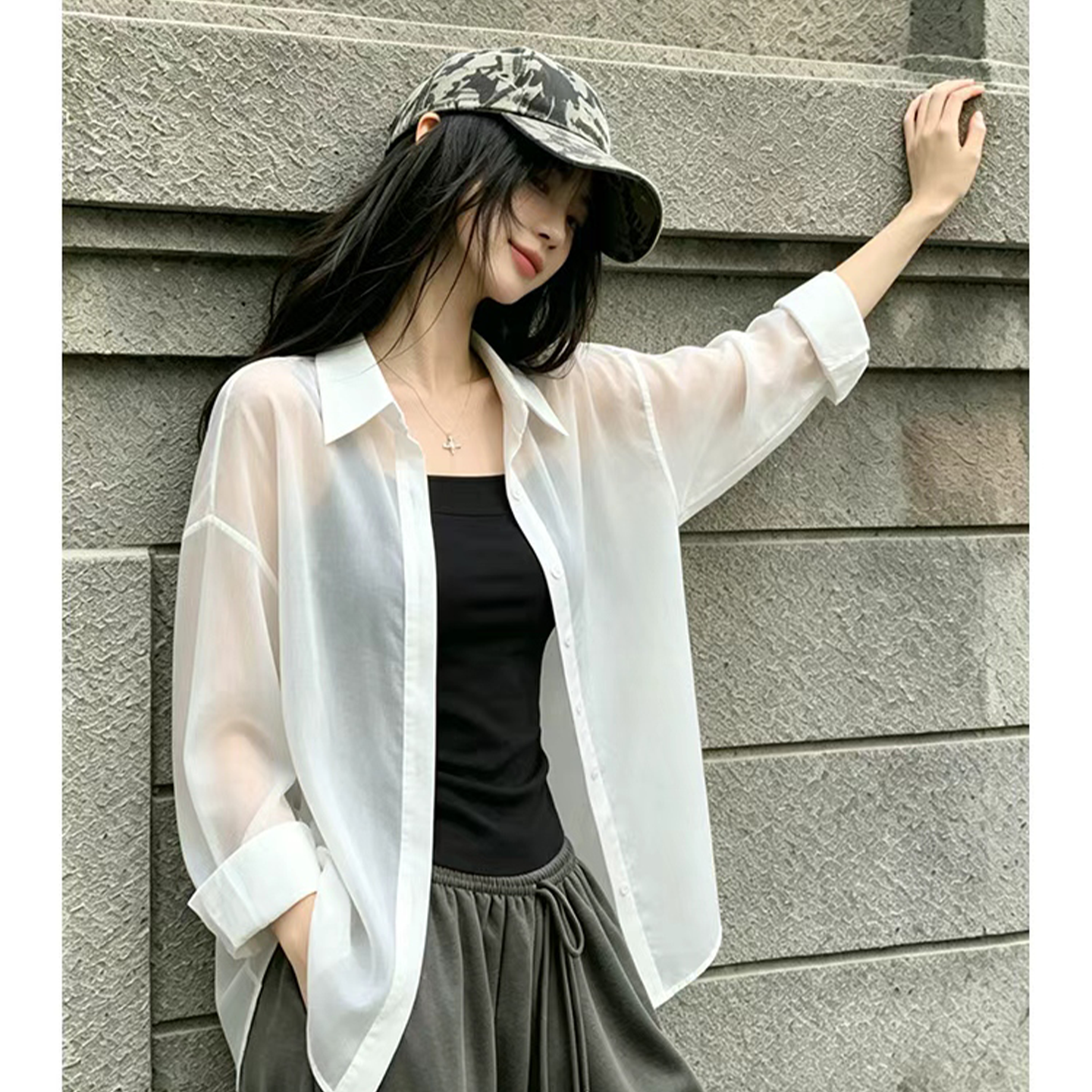 2026 새로운 프랑스식 바람 한 부서 Tulle 자외선 차단 여성 셔츠 여름 긴팔 루즈핏 화이트 외부 가져 가라. 다용도 맨위