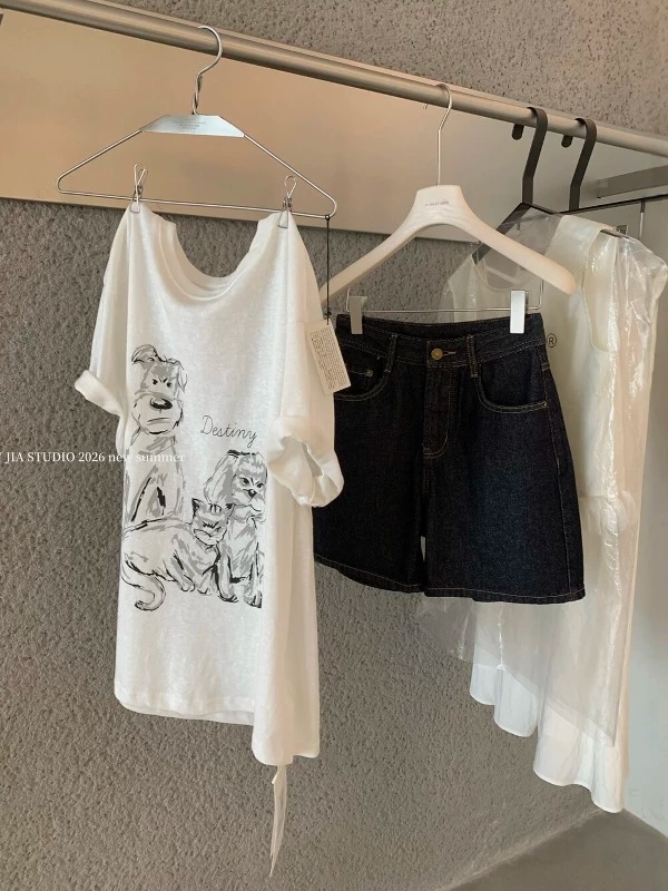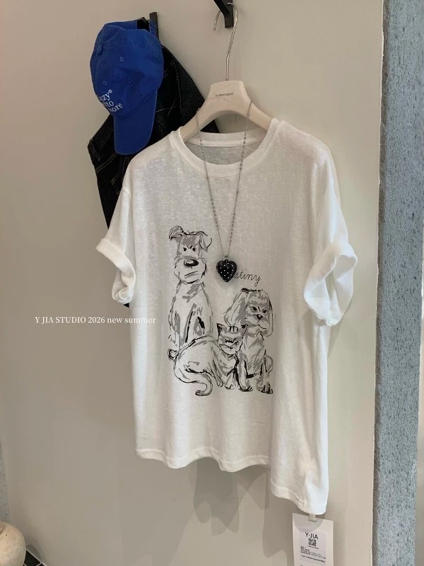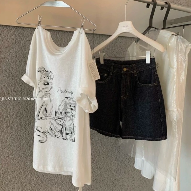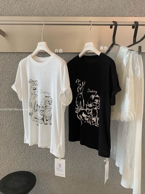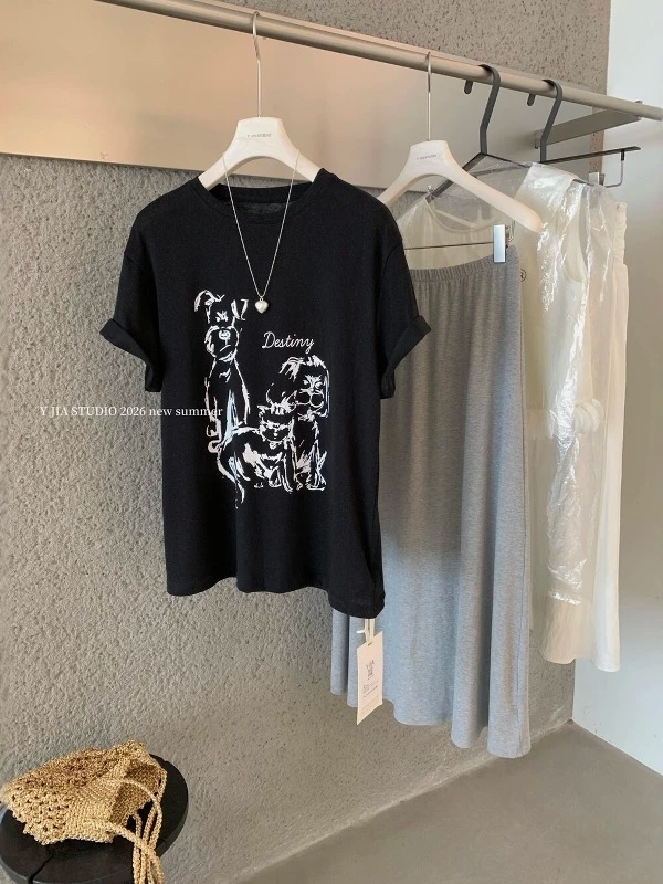 경관 그림 21 순면 210 그램 여름 드레스 한 부서 반팔 티셔츠 여성 한국 스타일 루즈핏 빅 사이즈 프린트