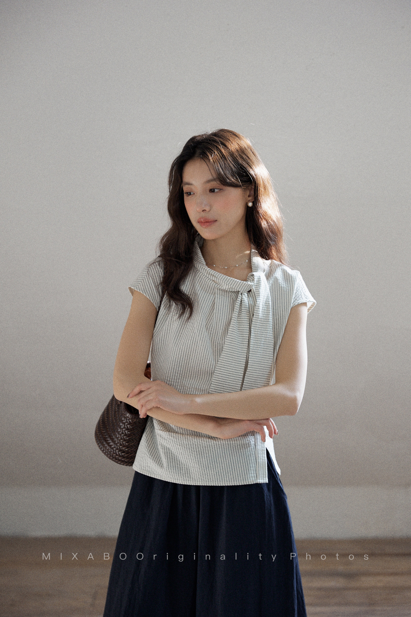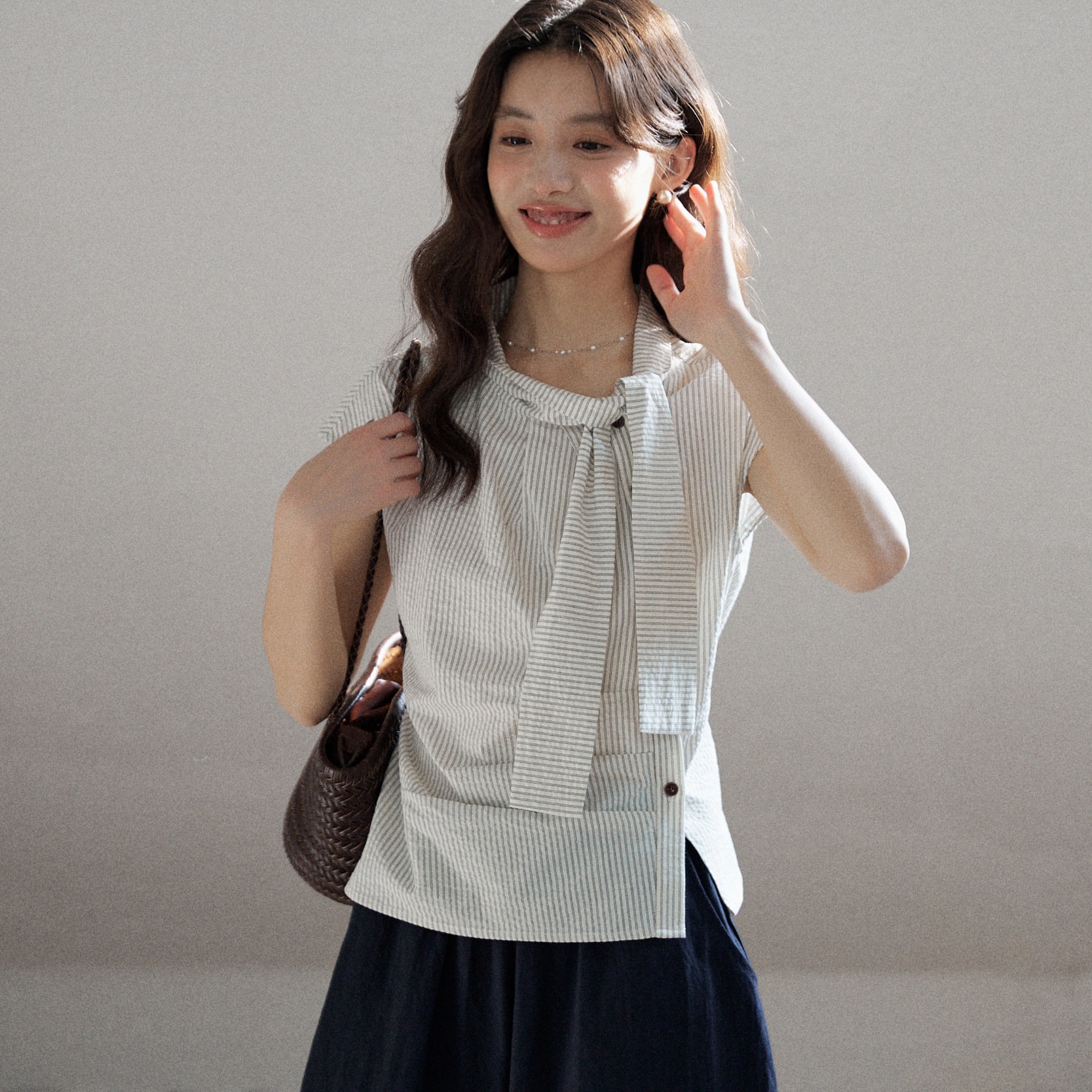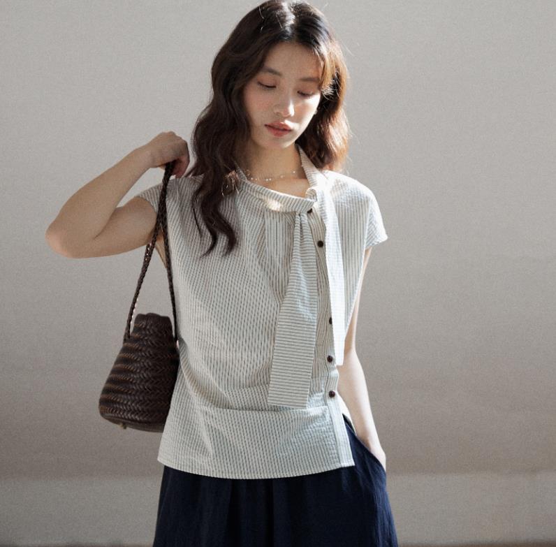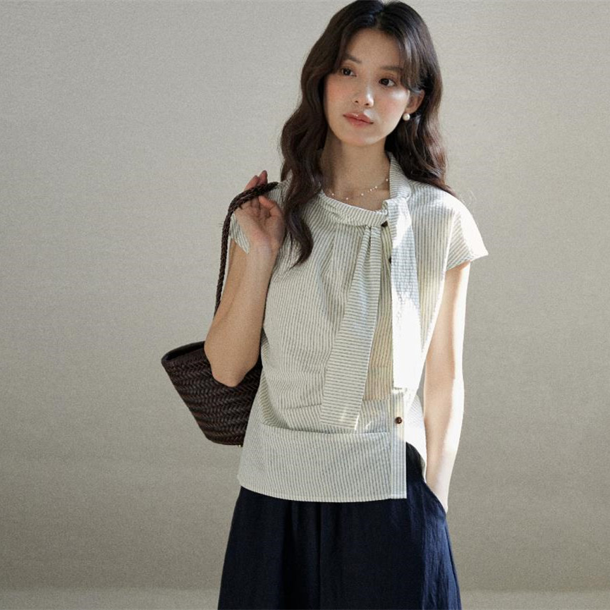 mixabo 일상 세로 줄무늬 반팔 여성 셔츠 여름 면 소재 비대칭 디자인 센스 리본 칼라 심지어 어깨 소매 맨위