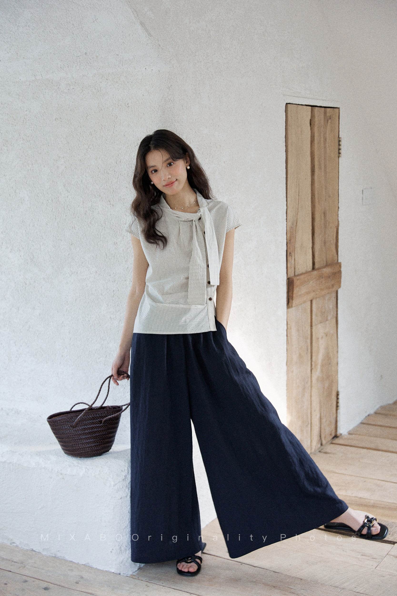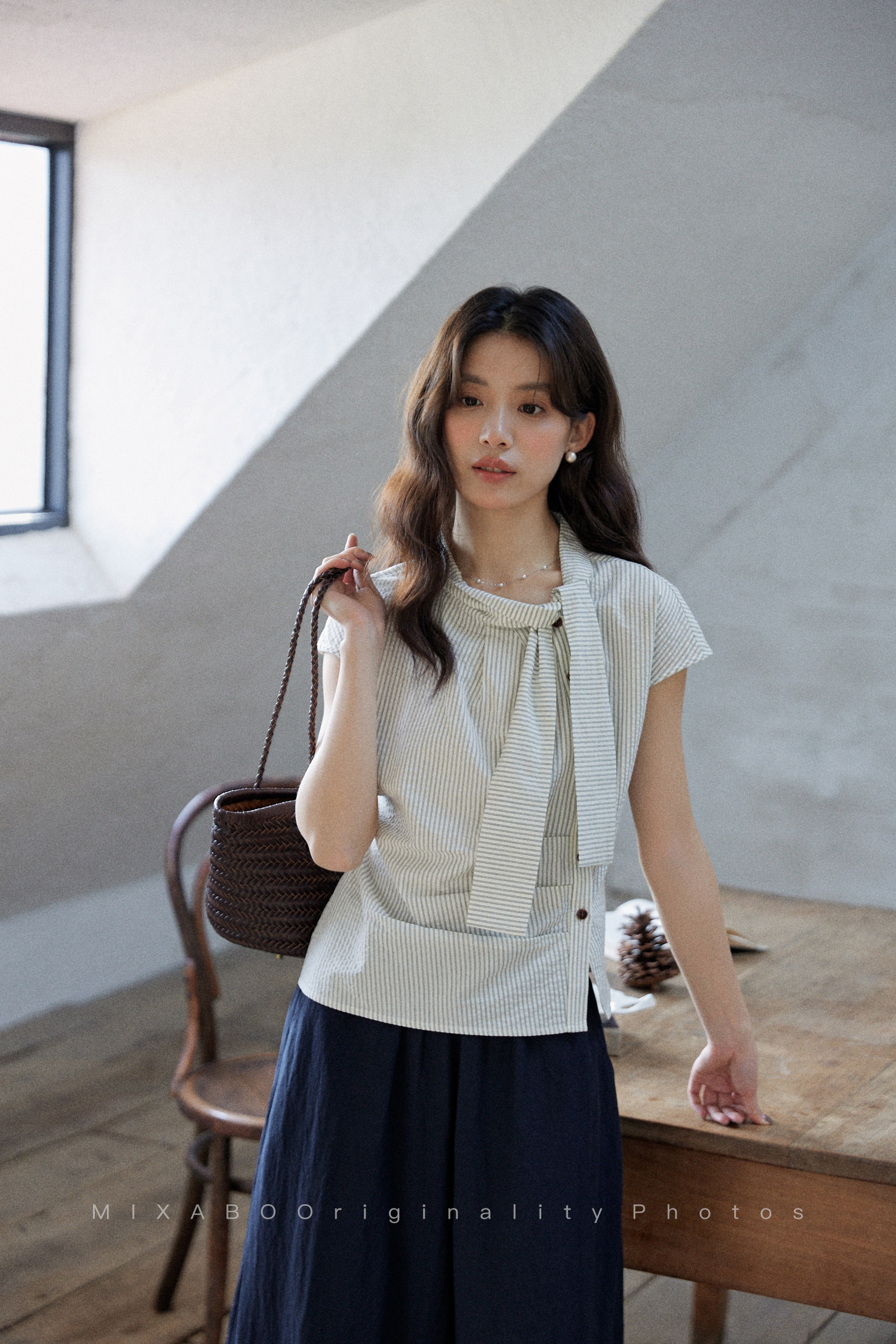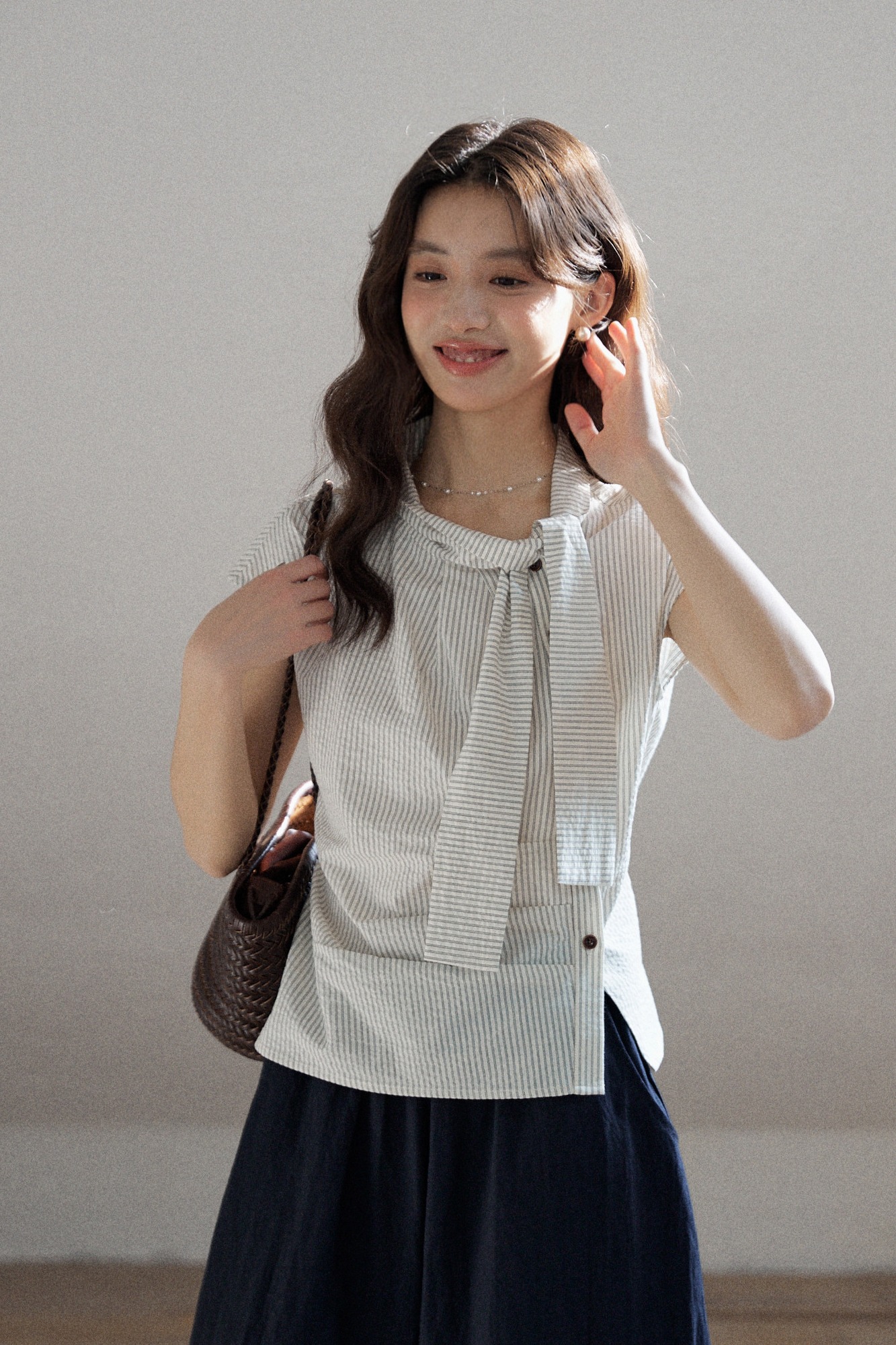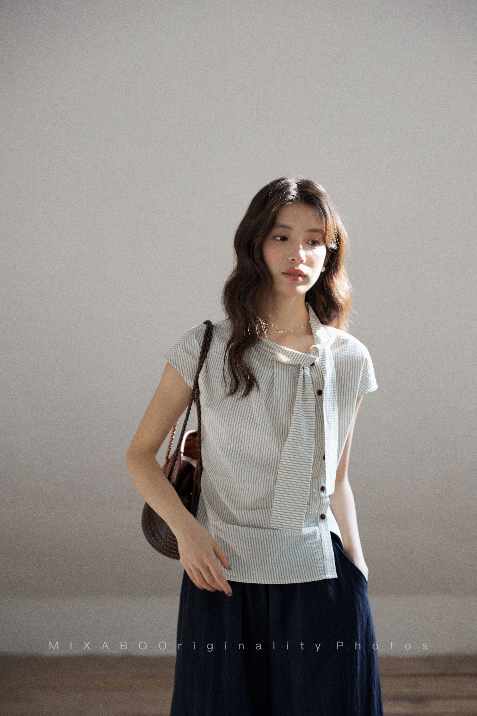 mixabo 일상 세로 줄무늬 반팔 여성 셔츠 여름 면 소재 비대칭 디자인 센스 리본 칼라 심지어 어깨 소매 맨위