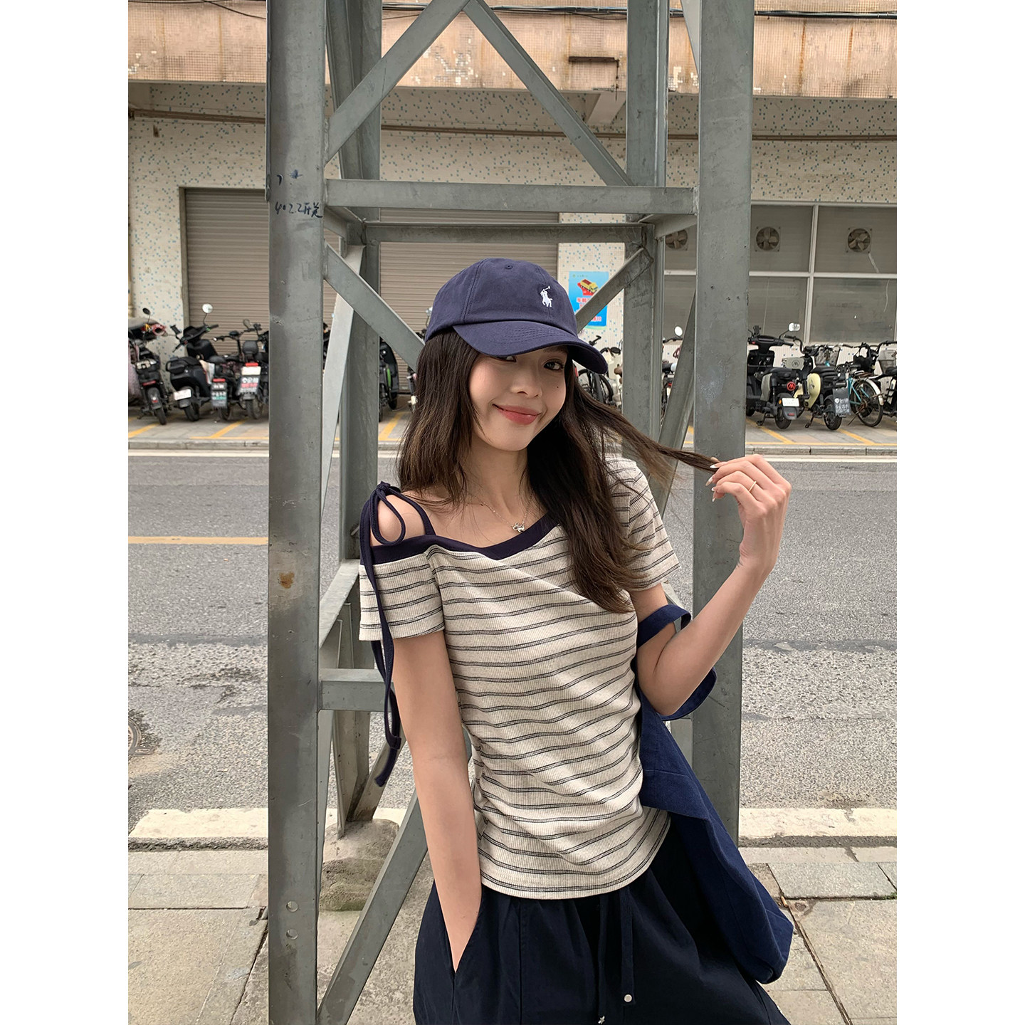 레드 맨 파빌리온 반팔 티셔츠 여성 2026 새로운 여름 착용 가져 가라. 튀김 거리 고유 한 아름다운 스트라이프 오프숄더 비스듬한 어깨 의류