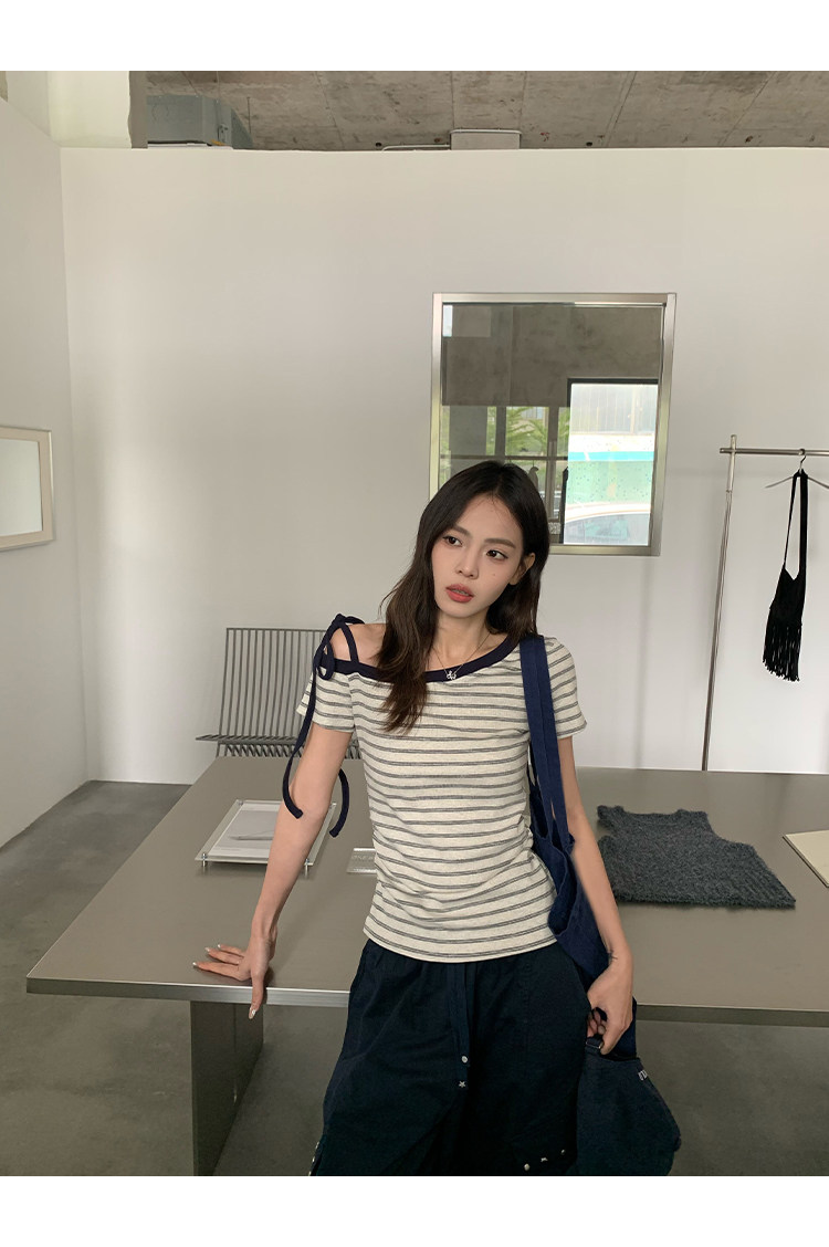 송 긍정적 인 En 스트라이프 비스듬한 어깨 반팔 티셔츠 여성 여름 한 부서 새로운 느긋한 센스 몸매 가꾸기 슬림해 보이는 오프숄더 작은 맨위