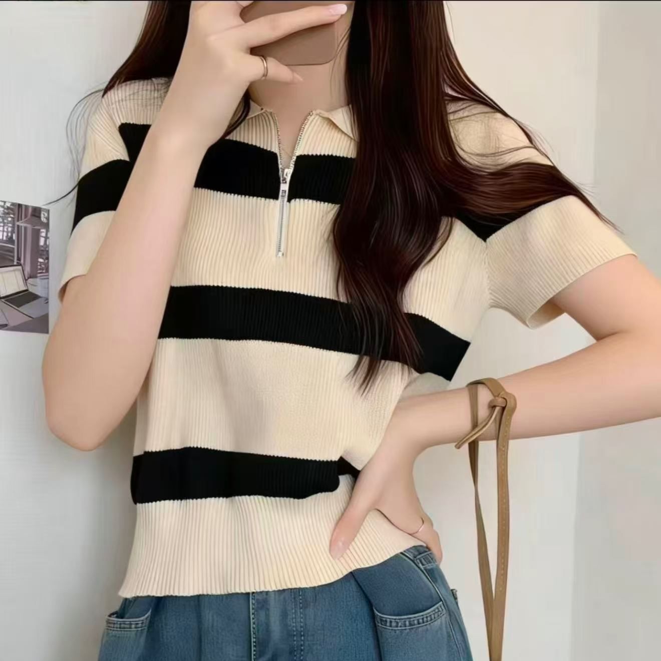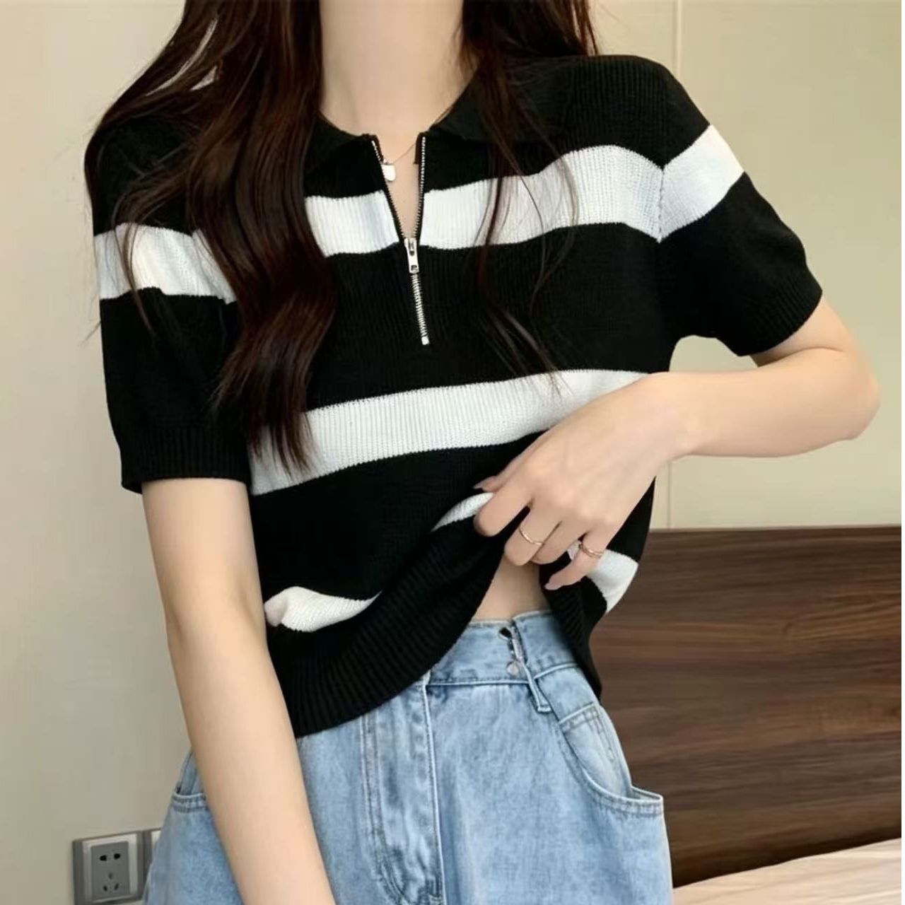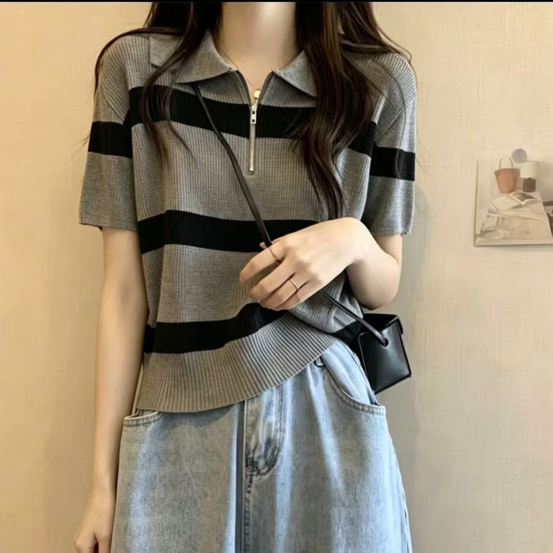2026 년 여름 새로운 디자인 센스 패션 폴로 칼라 지퍼 하프 열린 가슴 배색 스트라이프 니트 풀오버 반팔