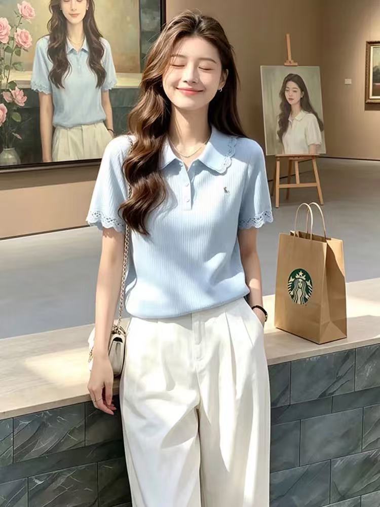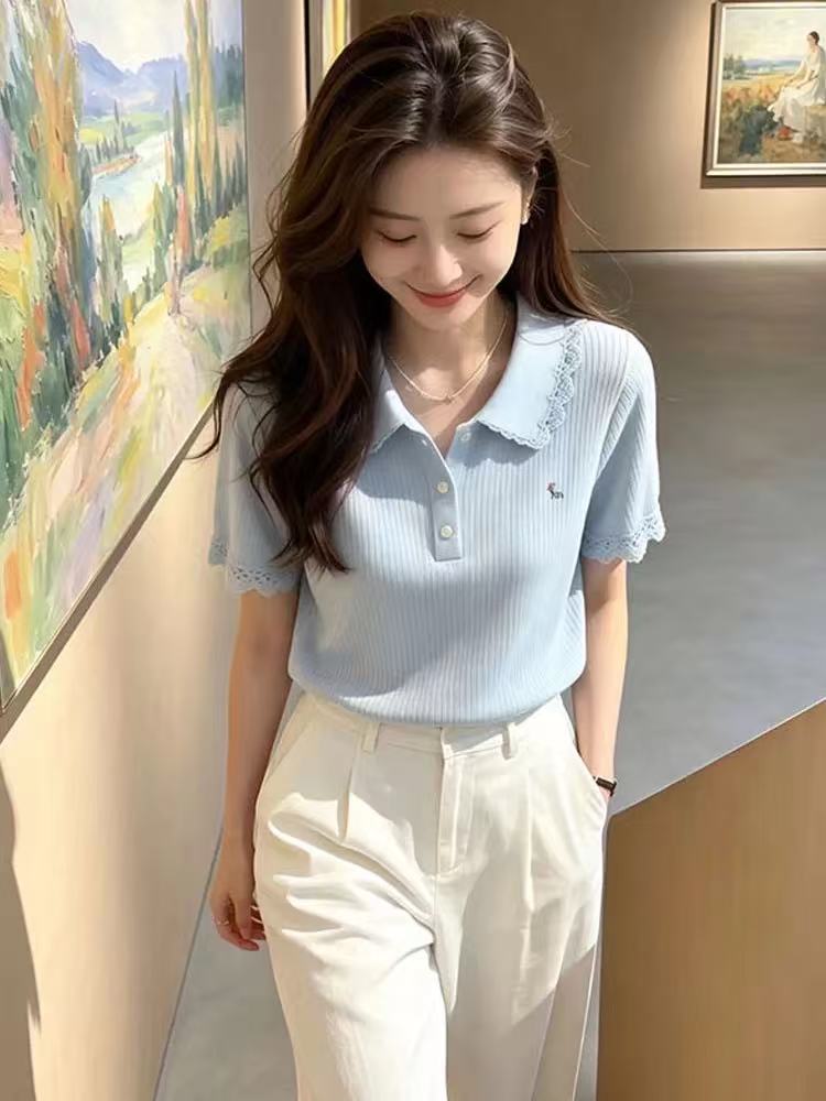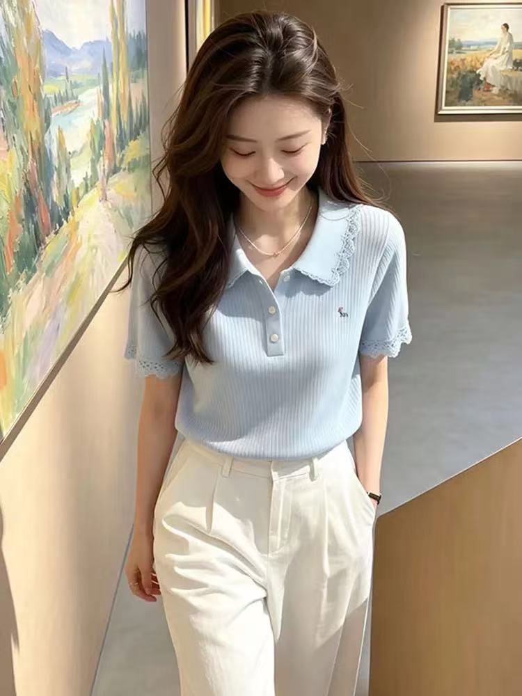 한 부서 레이스 조각 반팔 POLO 칼라 니트 스웨터 여성 2026 여름 새로운 부드러운 연령 감소 티셔츠 맨위