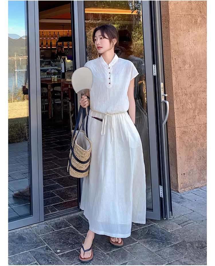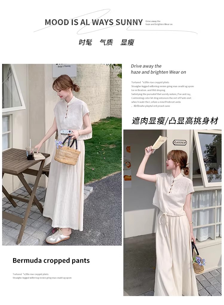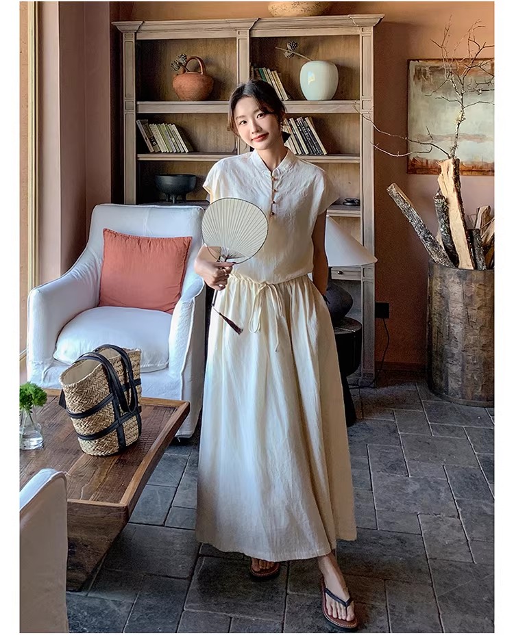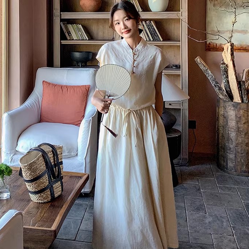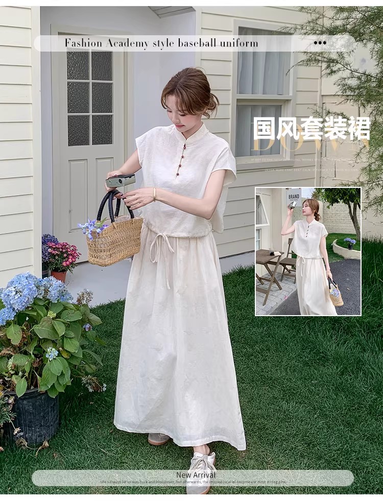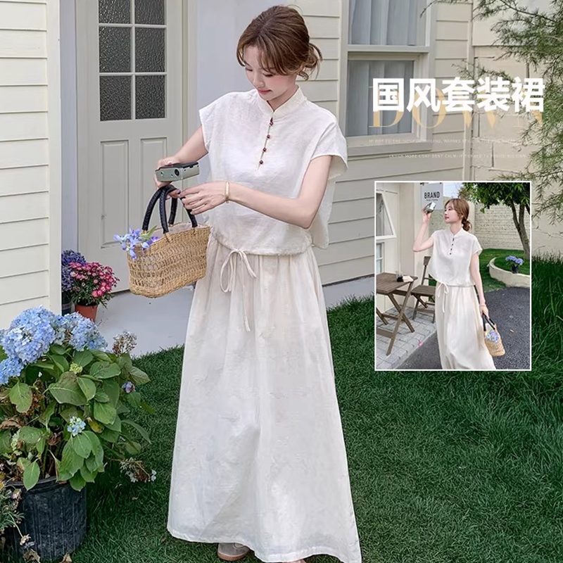 새로운 중식 국풍 투피스 슈트 단추 밑단 펌프 로프 반팔 맨위 여성 허리밴드 반신 스커트 여름 세트