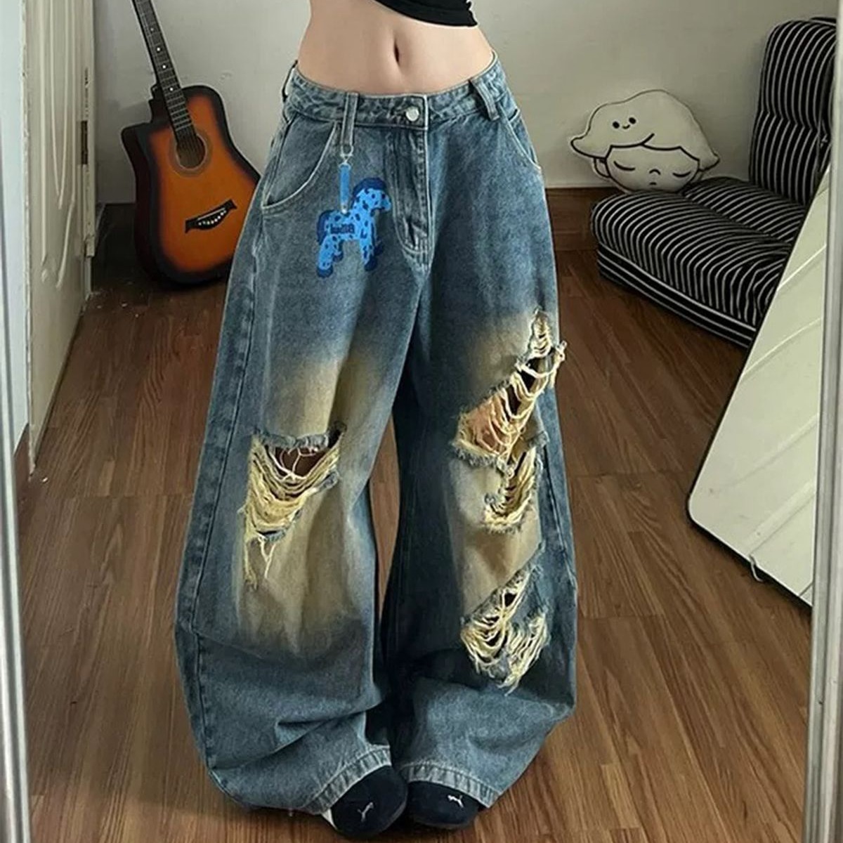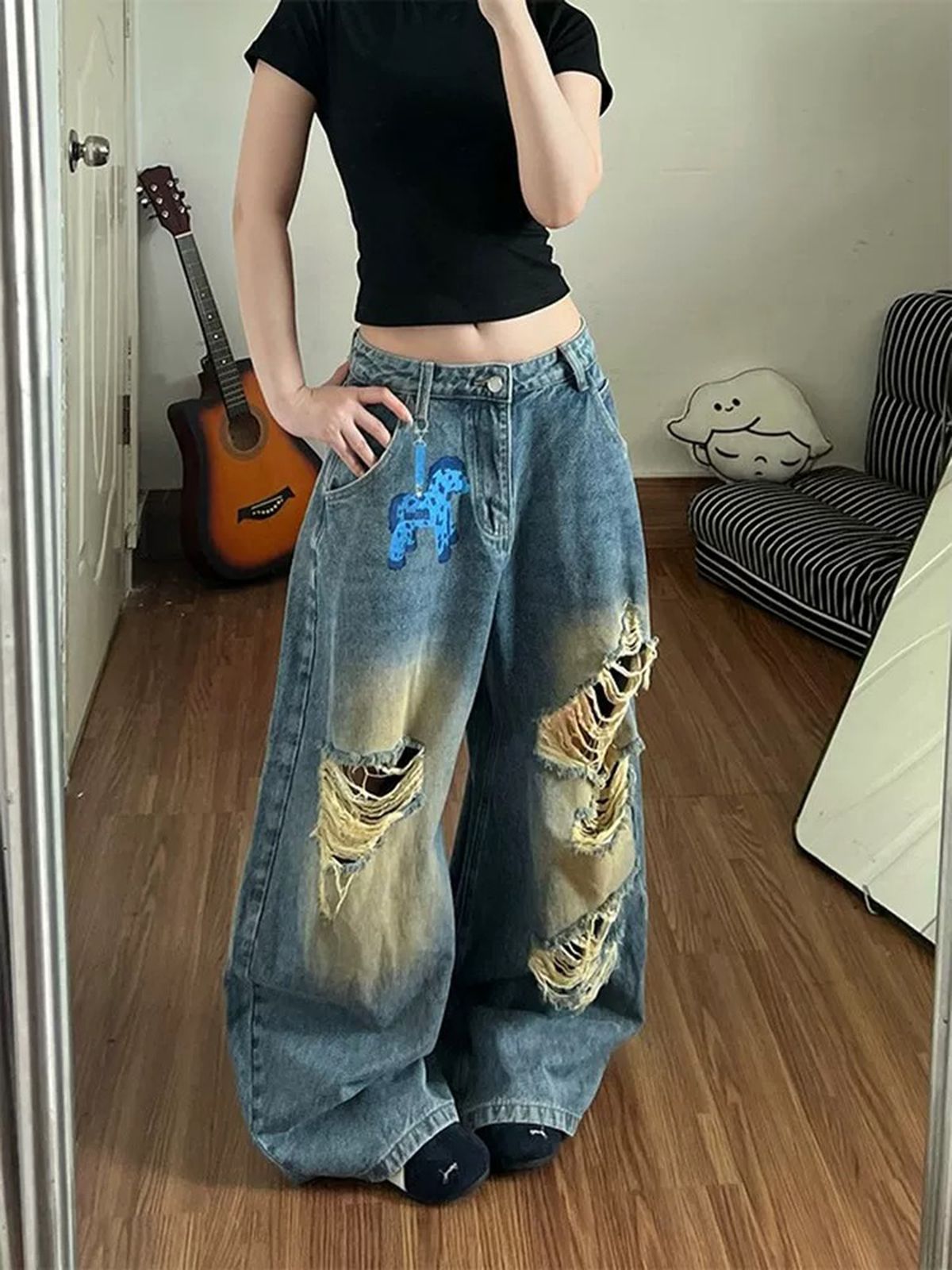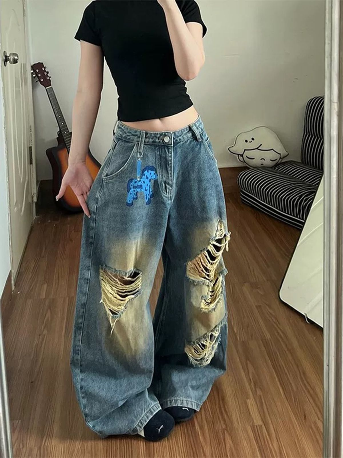 거리 더러운 염색 마 오래된 찢어진 부분 모통이 칼 청바지 바지 여자 2026 여름 새로운 작은 말 프린트 와이드 레그 팬츠