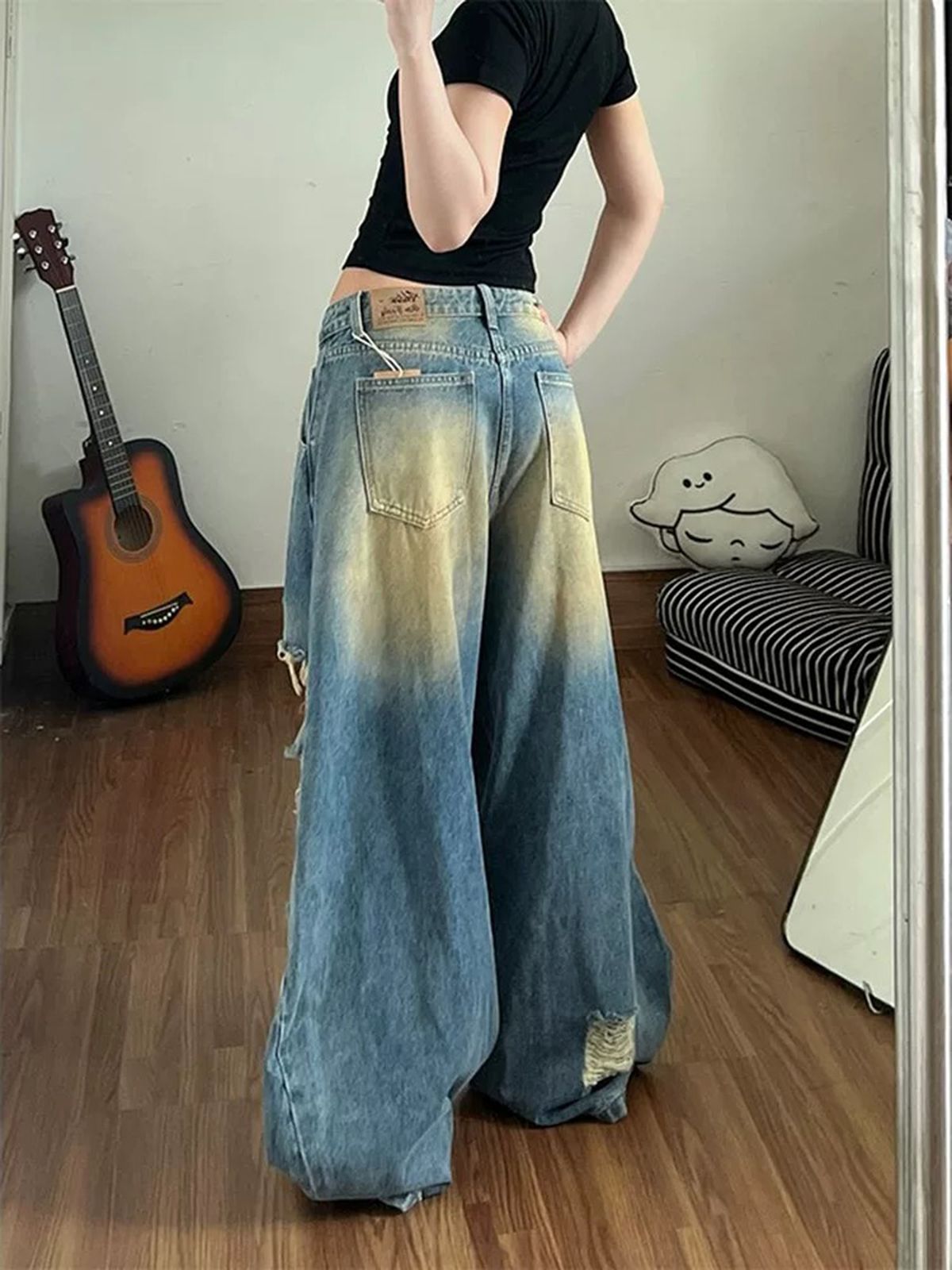 아메리칸 레트로 워싱 찢어진 부분 청바지 여성 새로운 로우 웨이스트 고급 루즈핏 넓은 다리 바나나 바지