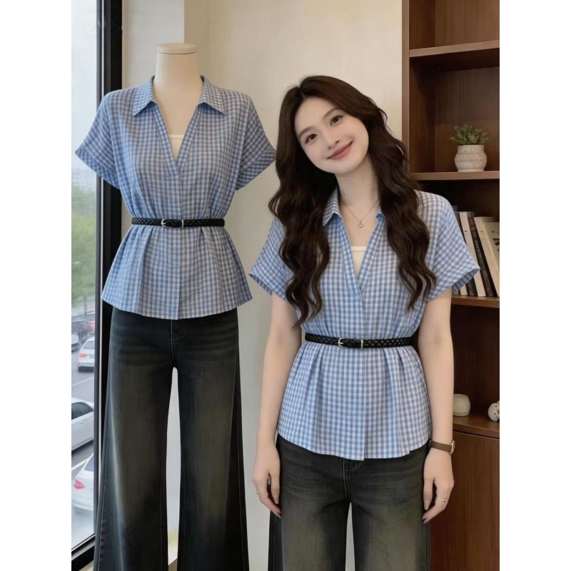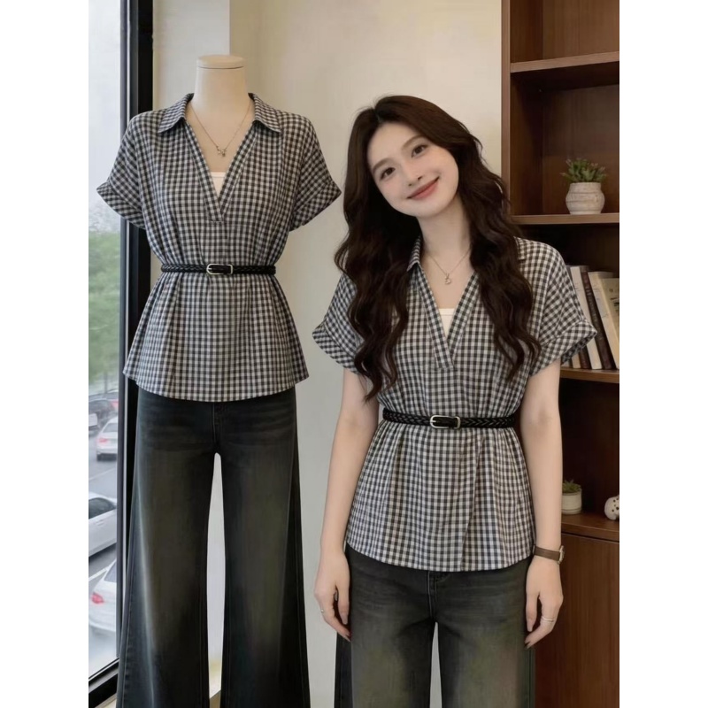 빅 사이즈 여성 의류 벨트 포함 허리 수축 깊은 V 넥 반팔 여성 셔츠 2026 여름 품격 루즈핏 슬림해 보이는 셔츠 맨위