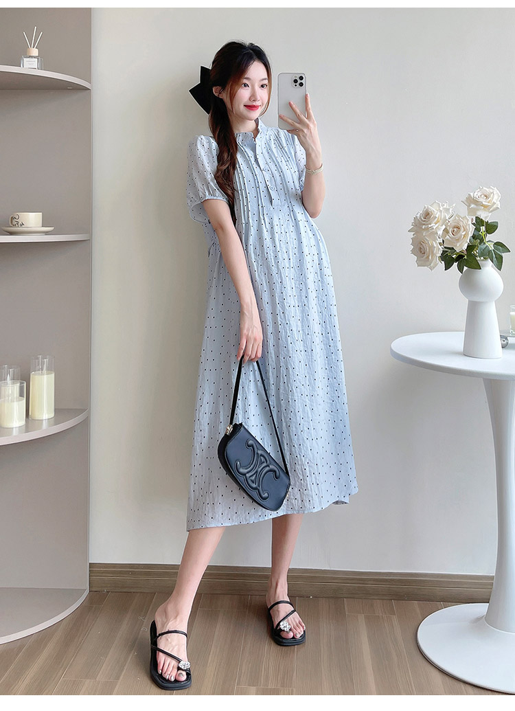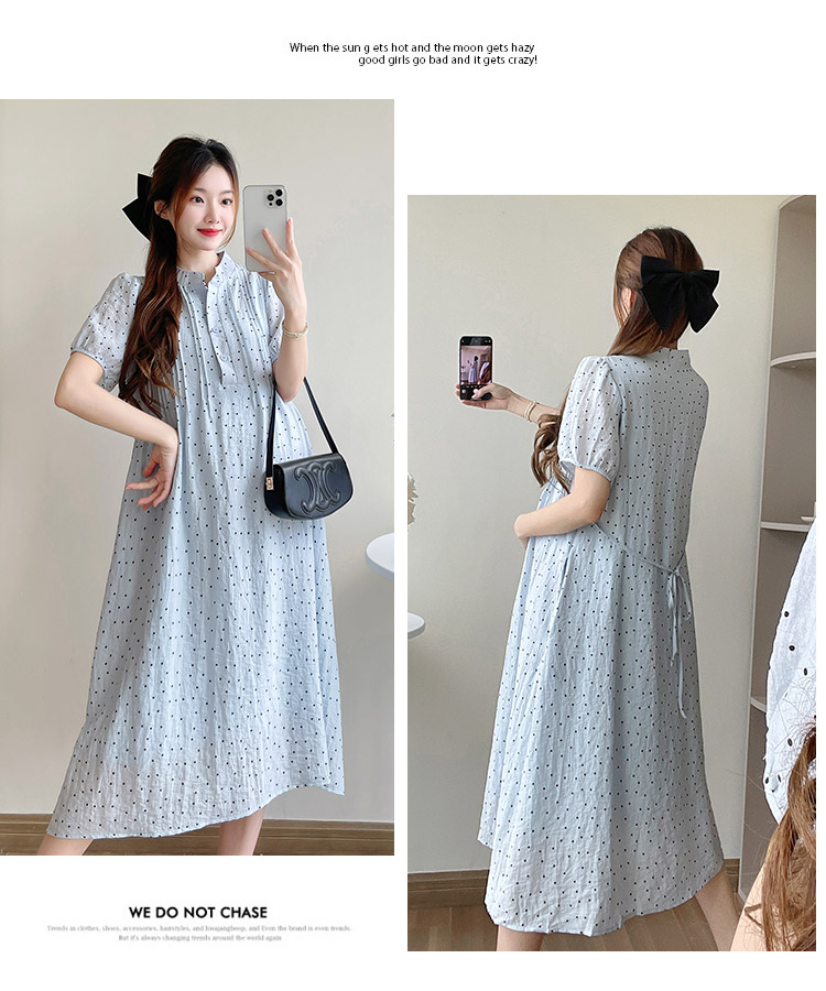 실사 임산부 여름 드레스 새로운 패션 도트 무늬 드레스 작은 청신 연령 감소 레이스업 품격 요정 치마