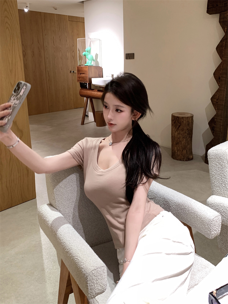 실사 편안함 단색 u 칼라 몸매 가꾸기 반팔 기본 셔츠