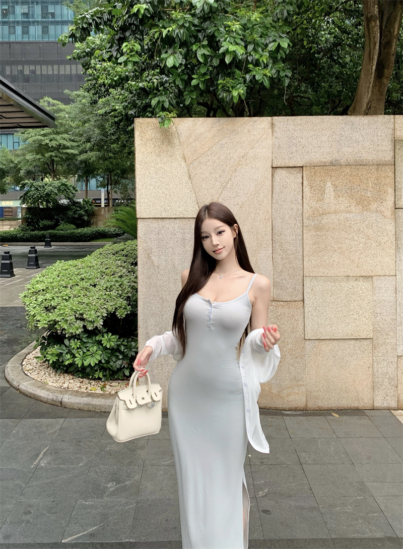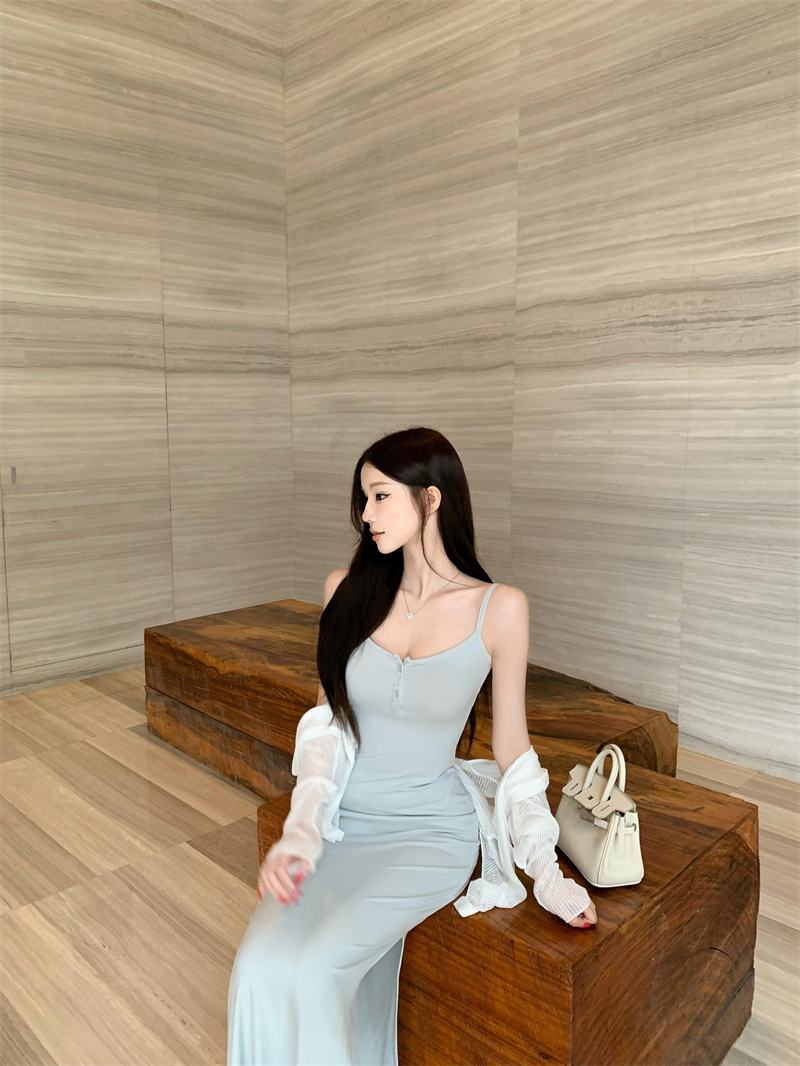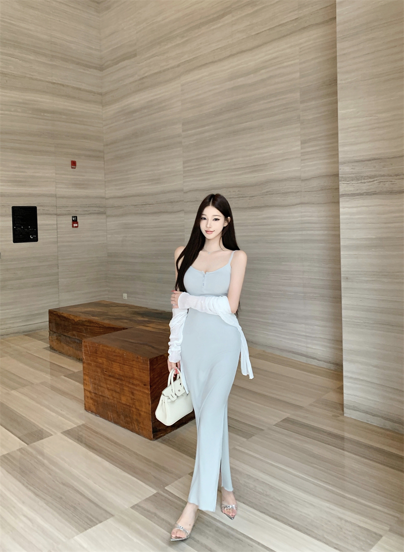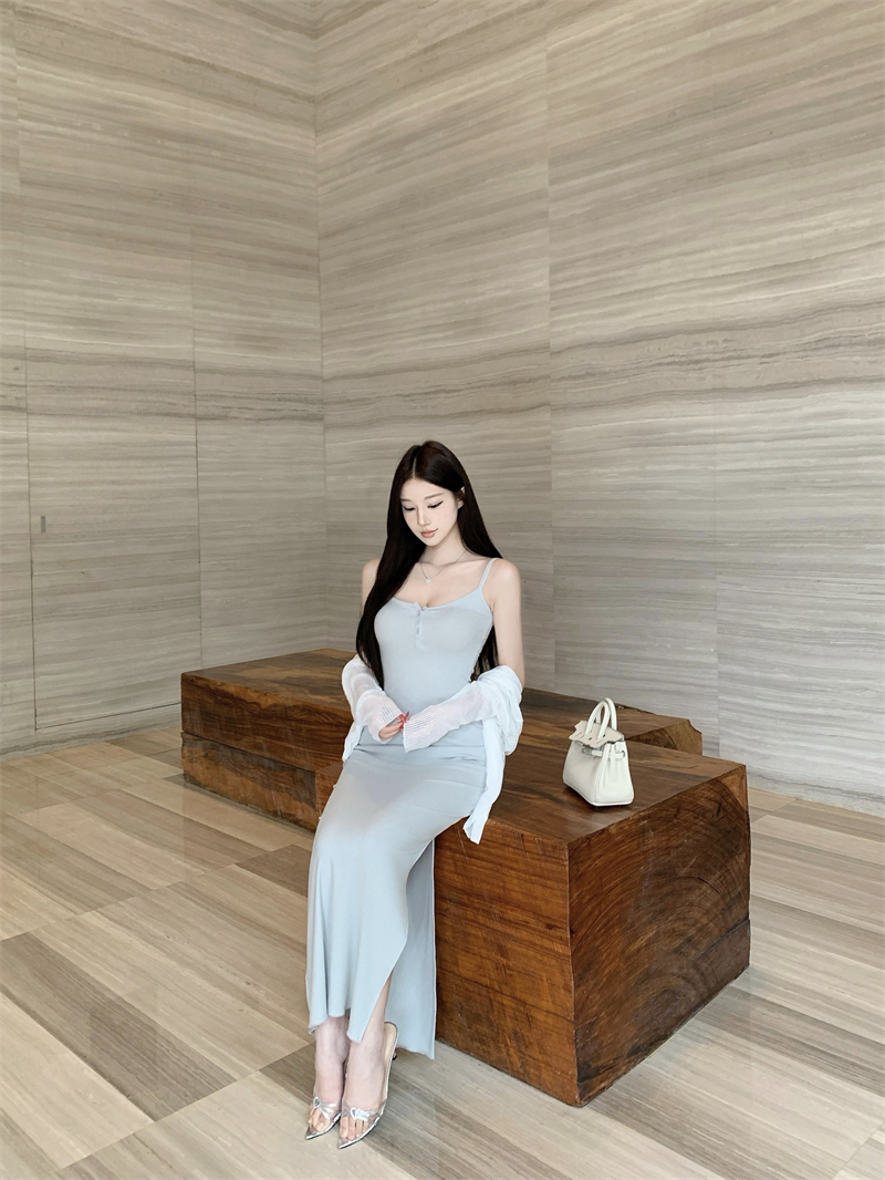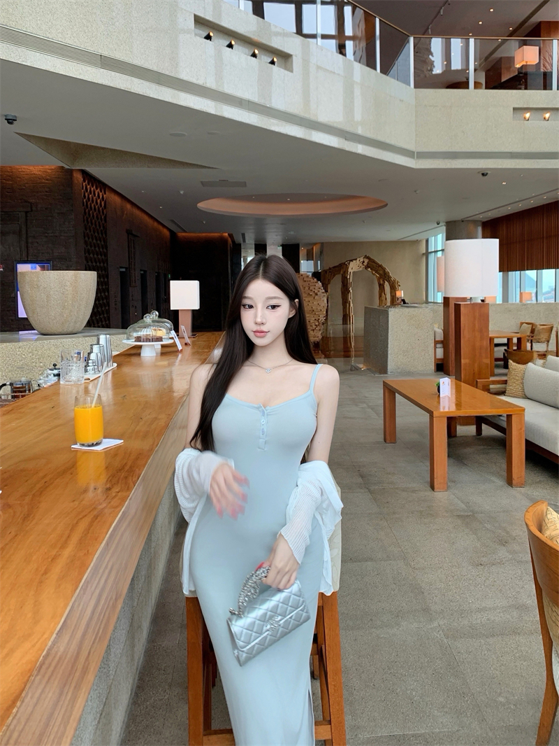 실사 파란색 새틴 튜브탑 드레스 여름 품격 순수한 욕망 허리 수축 치마