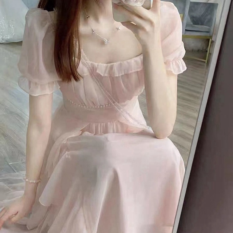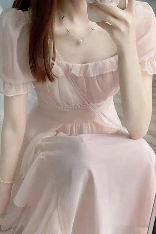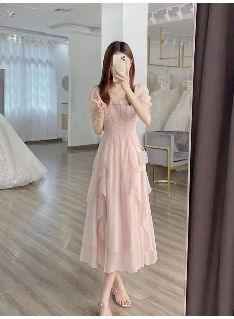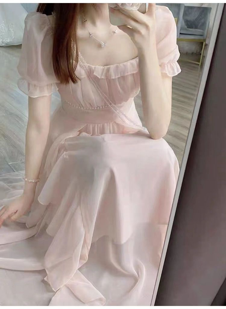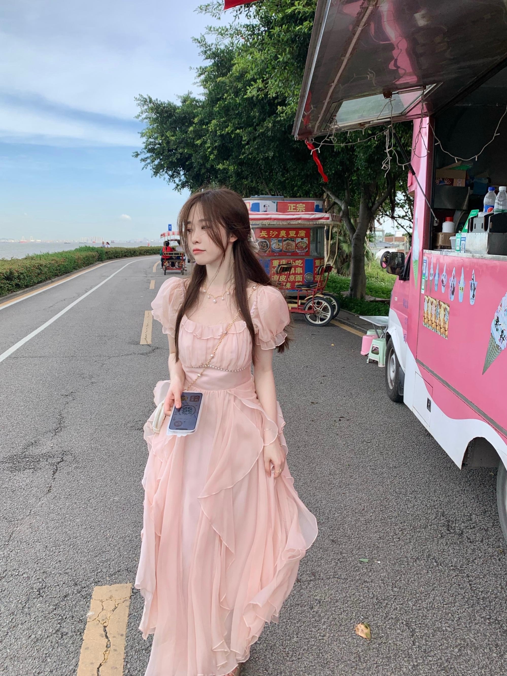 프랑스식 핑크색 쉬폰 점프 슈트 치마 여름 질감 고급 센스 허리 수축 슬림해 보이는 품격 부드러운 바람 요정 롱 스커트