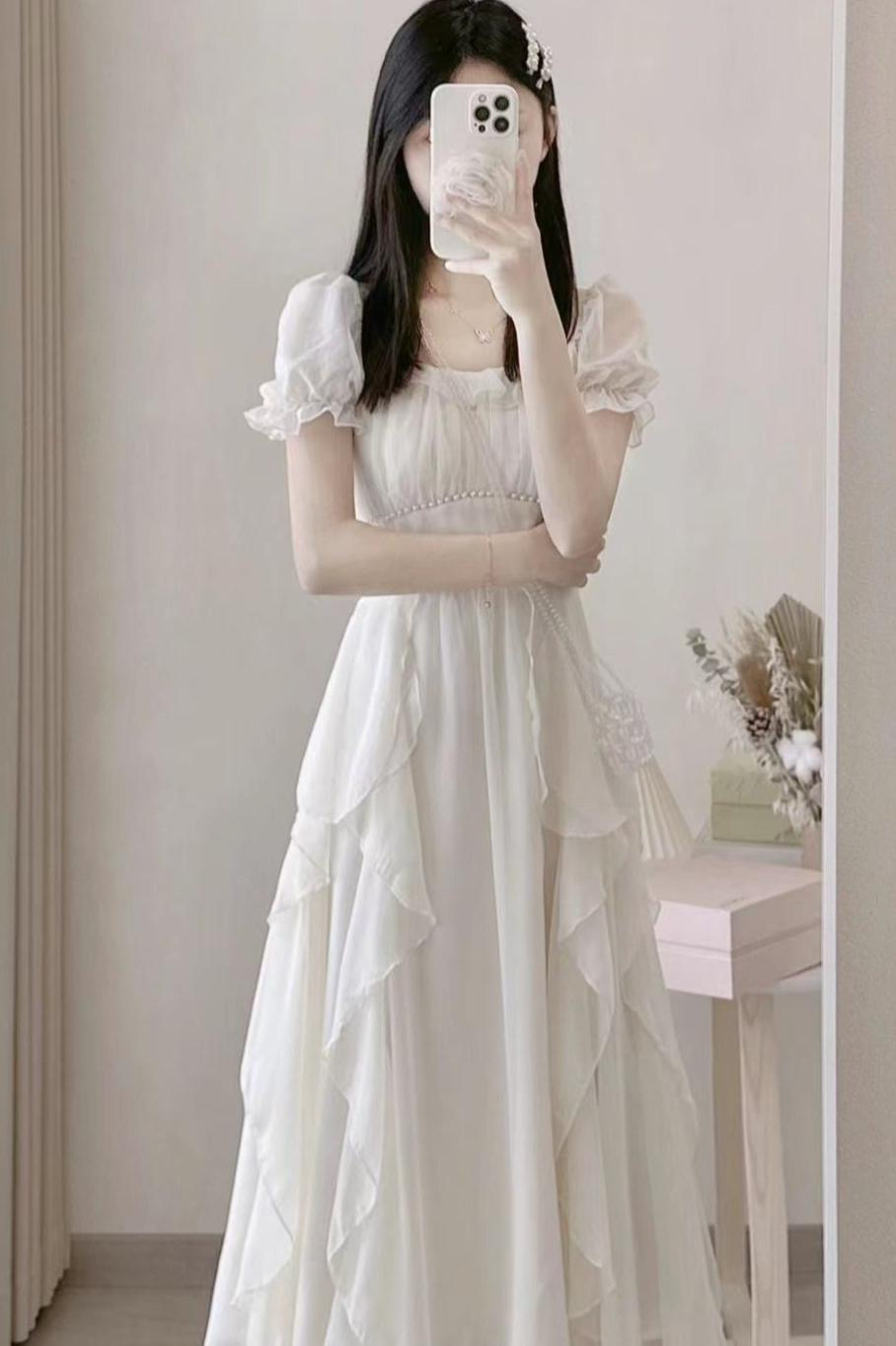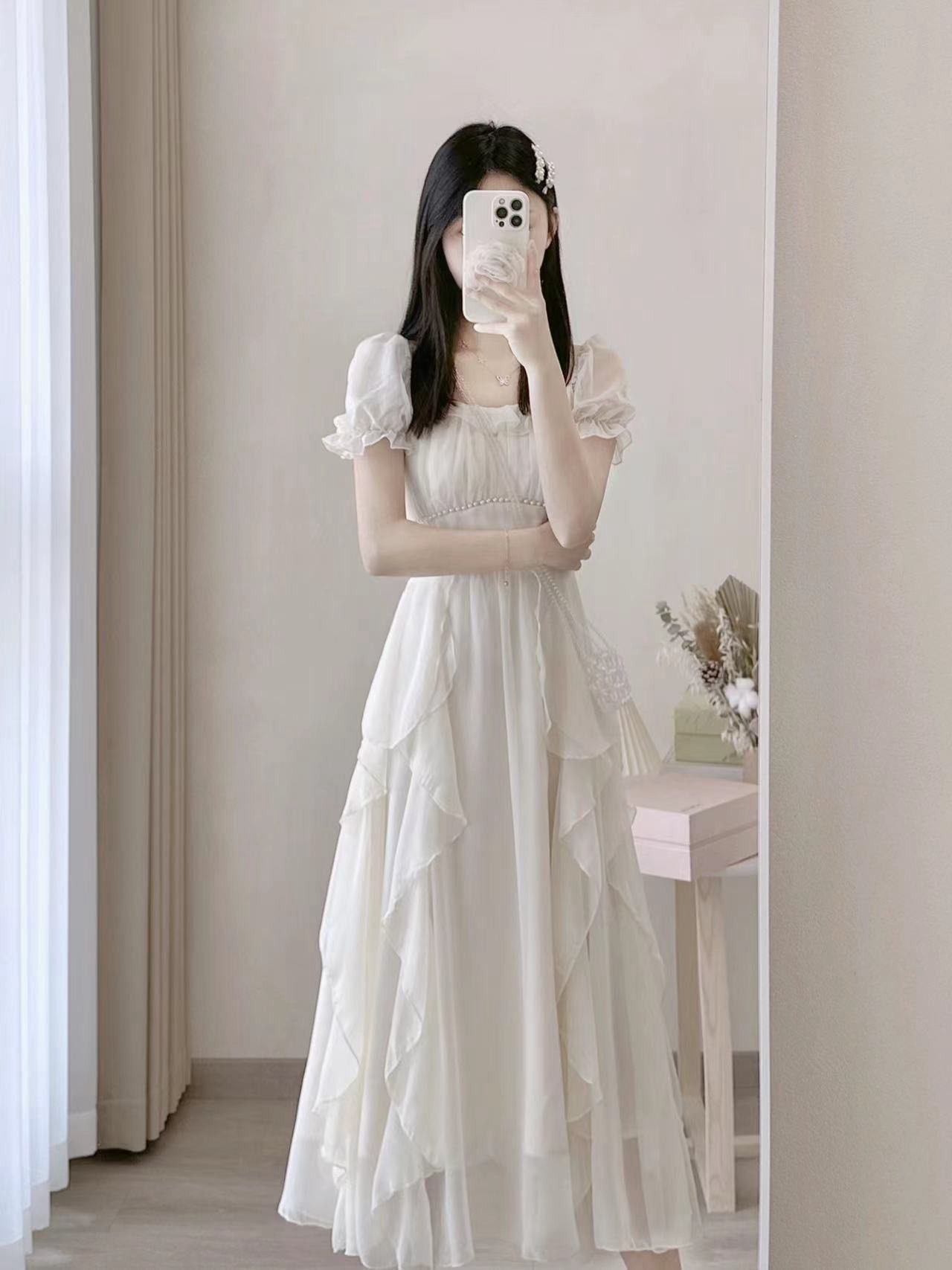 callmeear 화이트 티 첫사랑 레이스 조각 허리 수축 드레스 자카드 프릴 맨위 여름