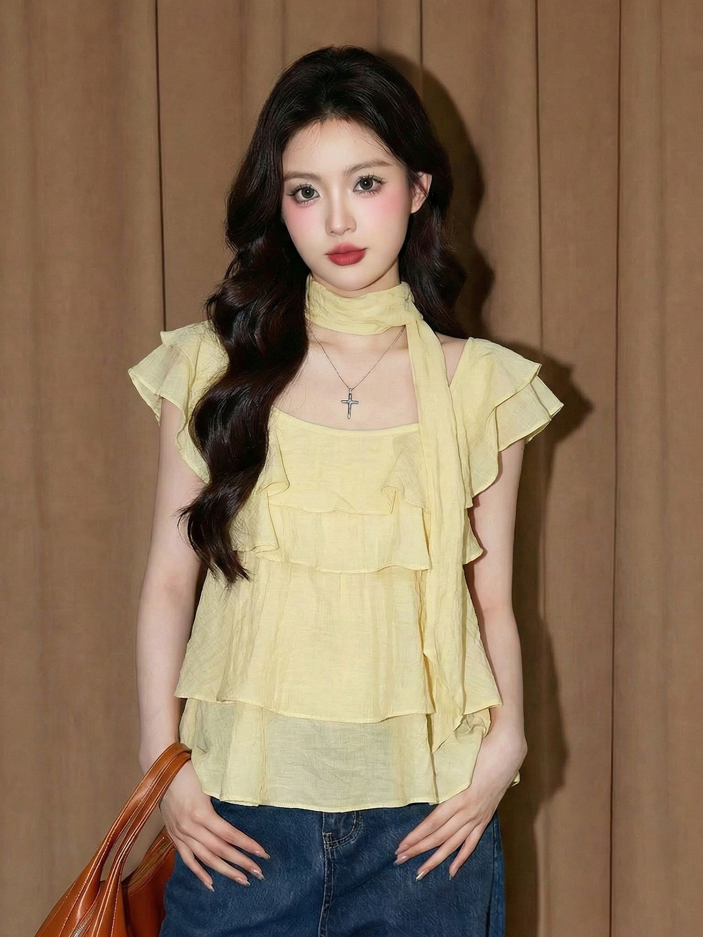 황색 행침 목 반팔 맨위 여성 여름 프랑스식 사소한 인형 셔츠 도파민 여행 아름다운 허리 수축 셔츠