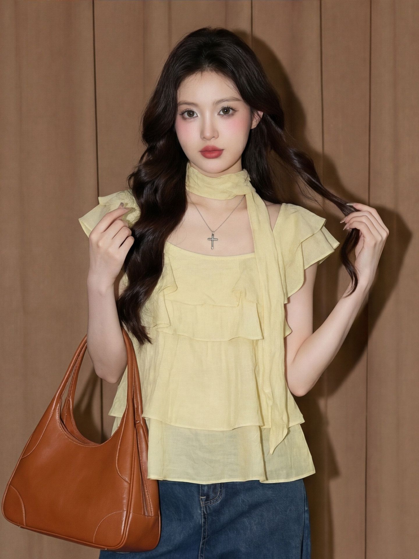 2025 여름 새로운 프랑스식 프릴 파란색 체크무늬 레트로 캐미솔 디자인 센스 민소매 맨위