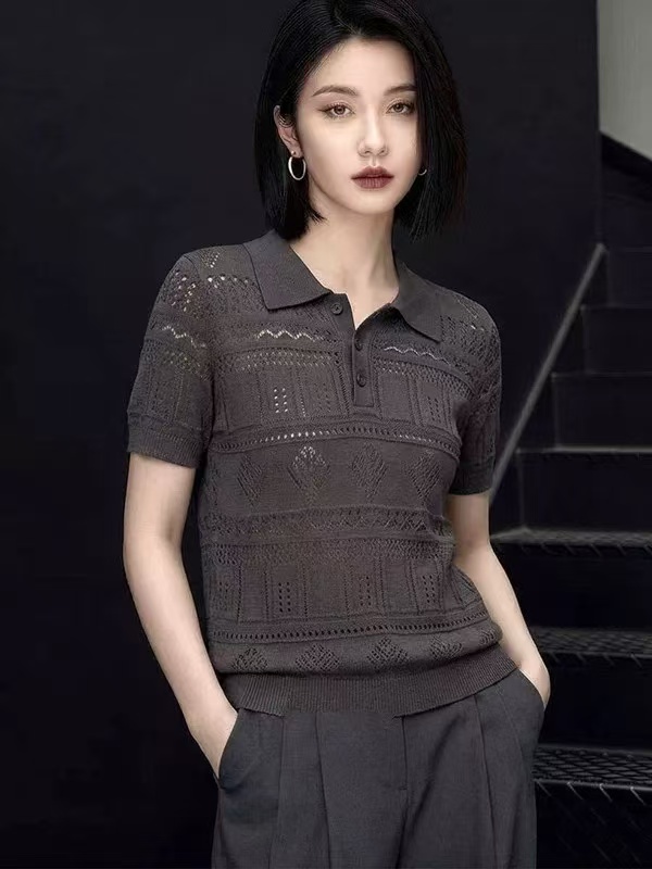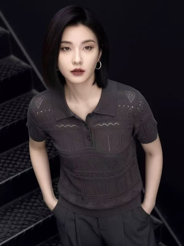 한 부서 자수 홀로우 아웃 폴로 칼라 얼음 실크 니트 반팔 여성 여름 외출용 고급 센스 슬림해 보이는 POLO 셔츠 미니멀리즘 맨위