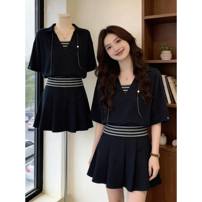 빅 사이즈 여성 의류 페이크 레이어드 티셔츠 허리밴드 품격 슬림해 보이는 캐주얼 한 마디 플리츠 치마 세트 여성 여름 지방 mm