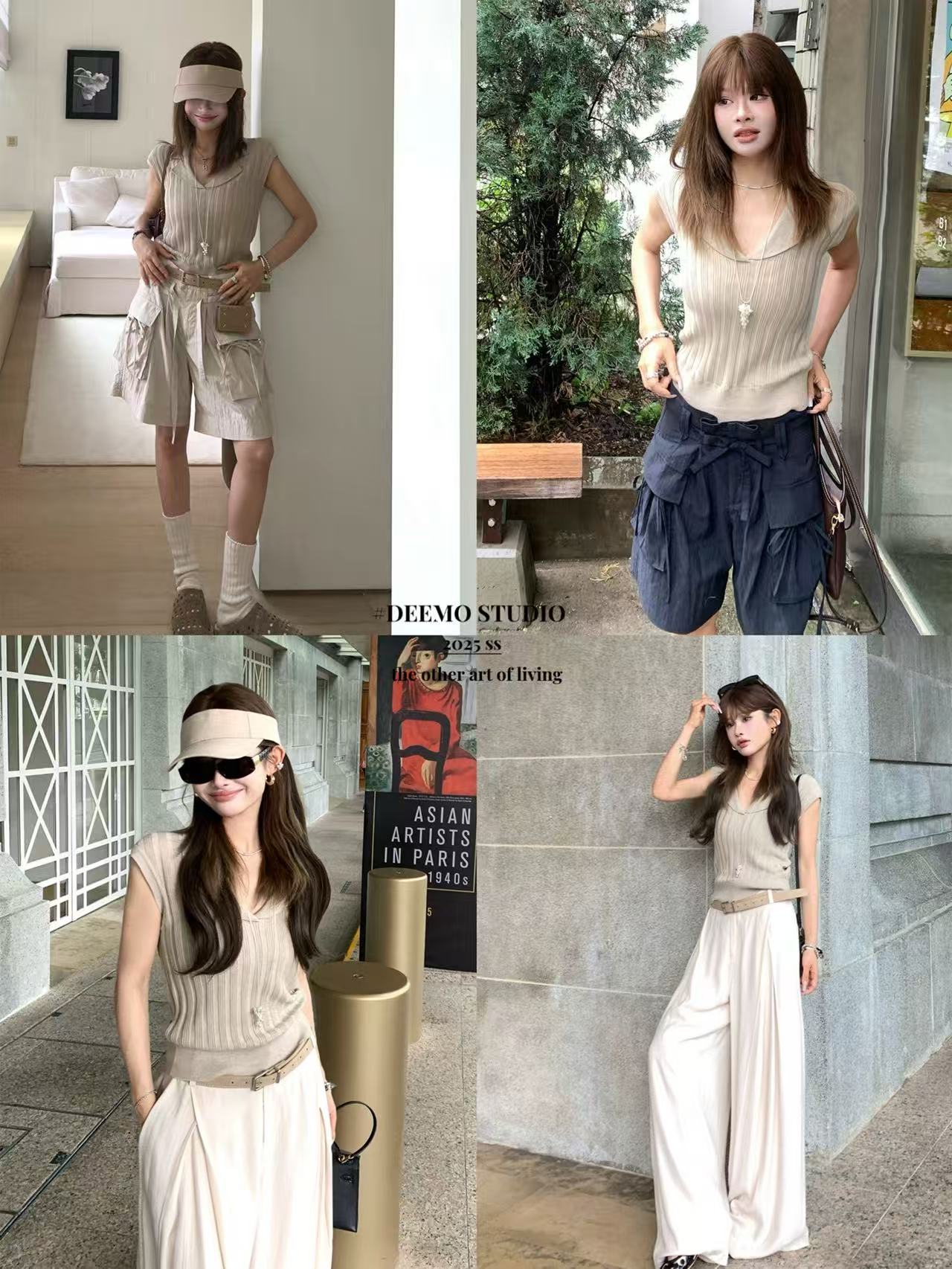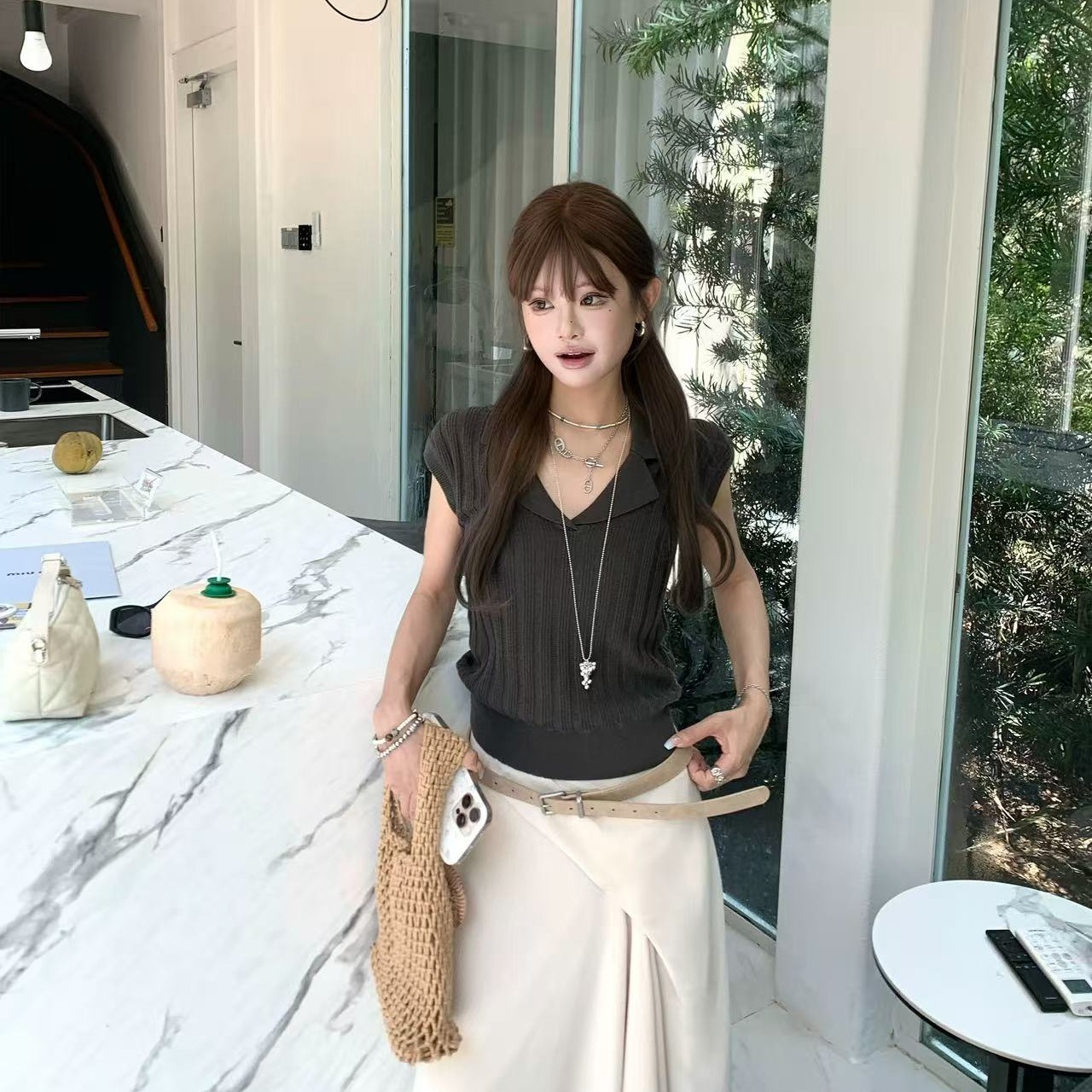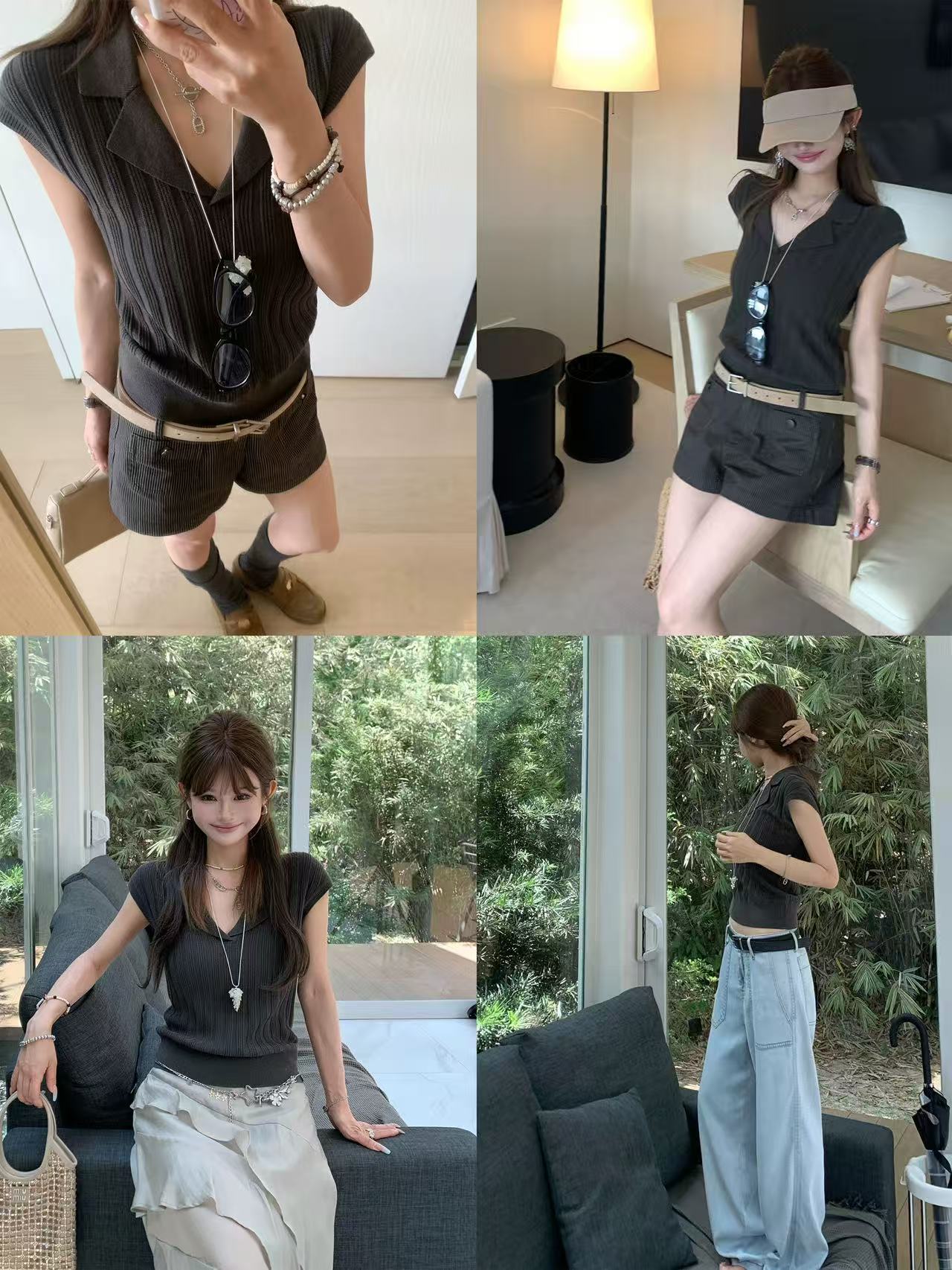 한국 스타일 패션 외국 가스 몸매 가꾸기 슬림해 보이는 니트 스웨터 여성 여름 미니멀리즘 고급 센스 깊은 V 넥 순수한 욕망 품격 맨위