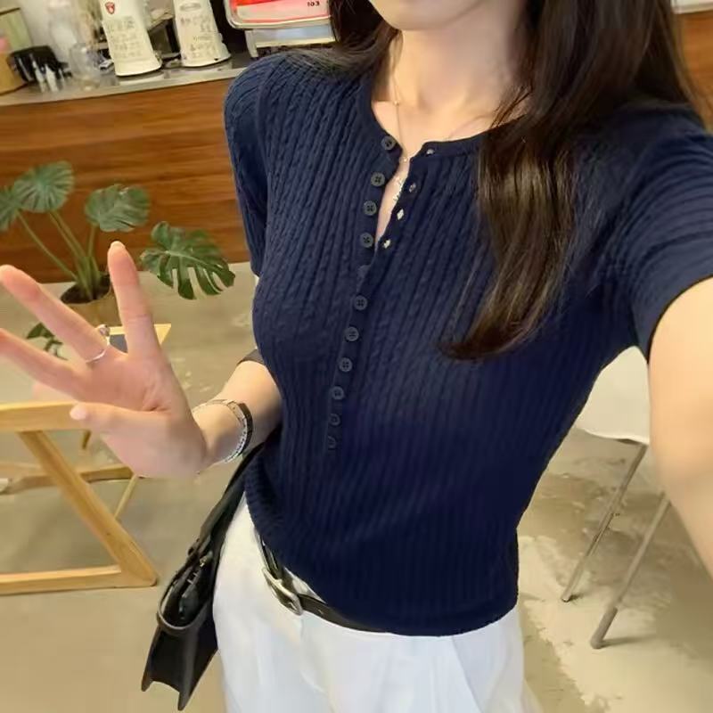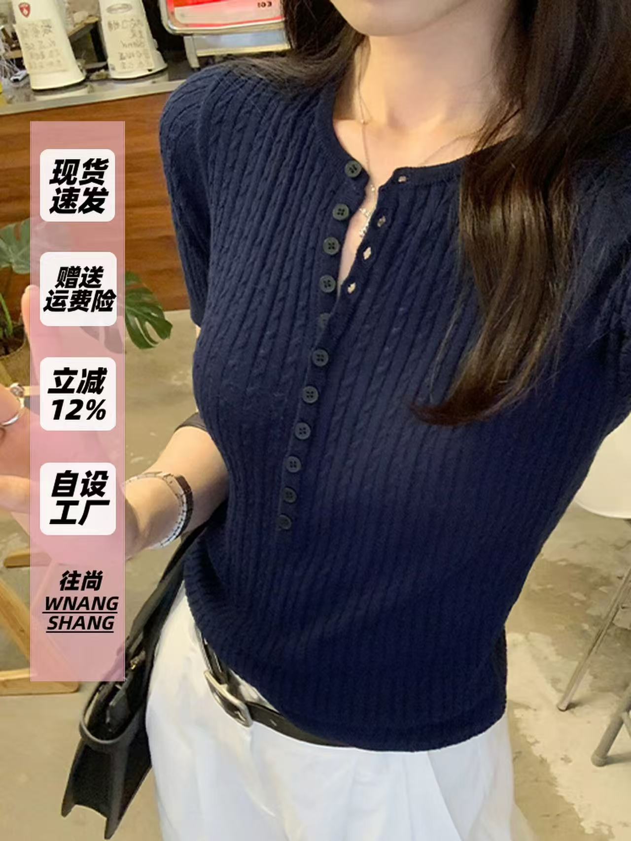 프랑스식 여름 새로운 단색 싱글 줄 버튼 V넥 니트 반팔 여성 품격 다용도 디자인 센스 파란색 맨위 서비스