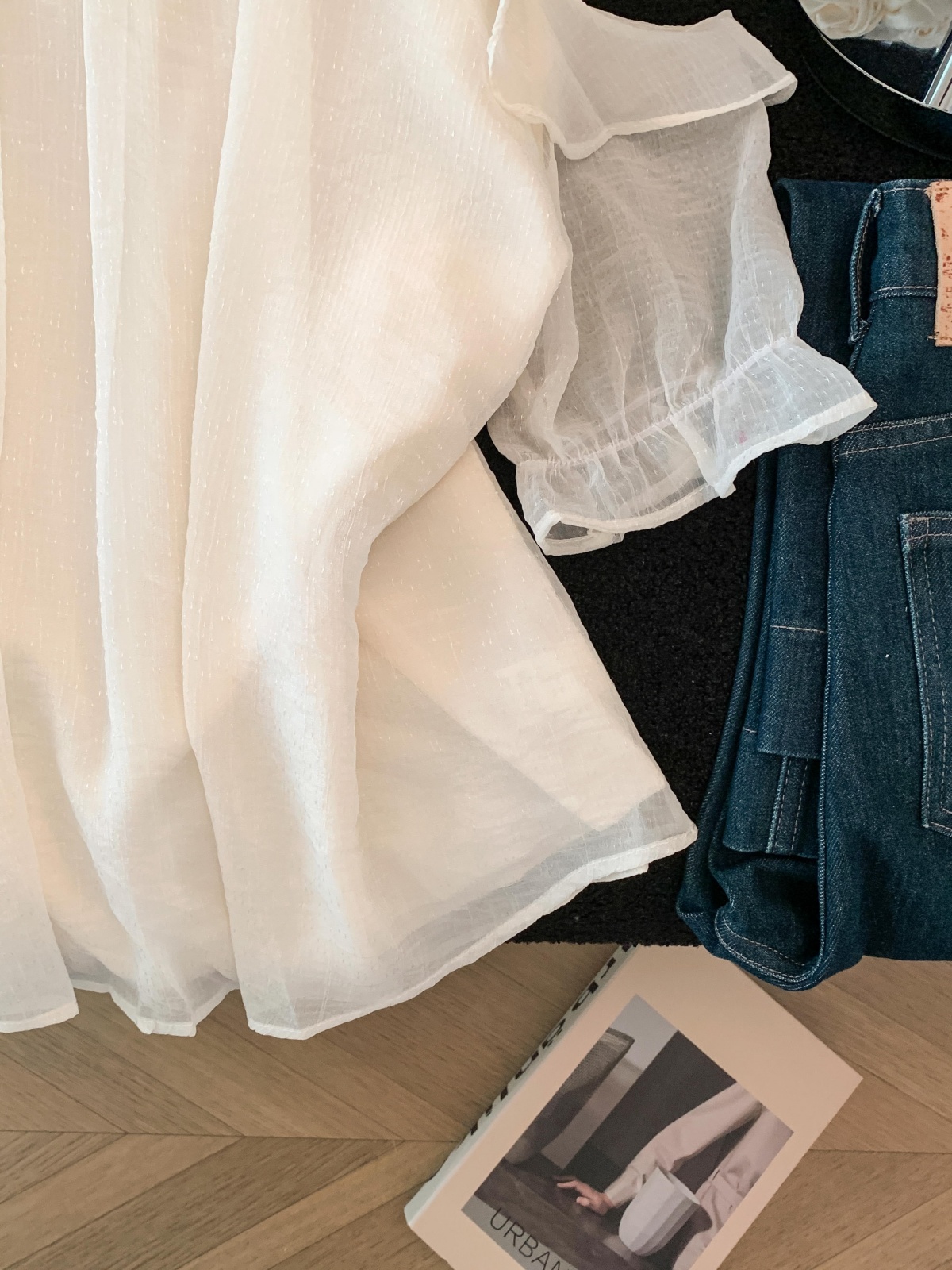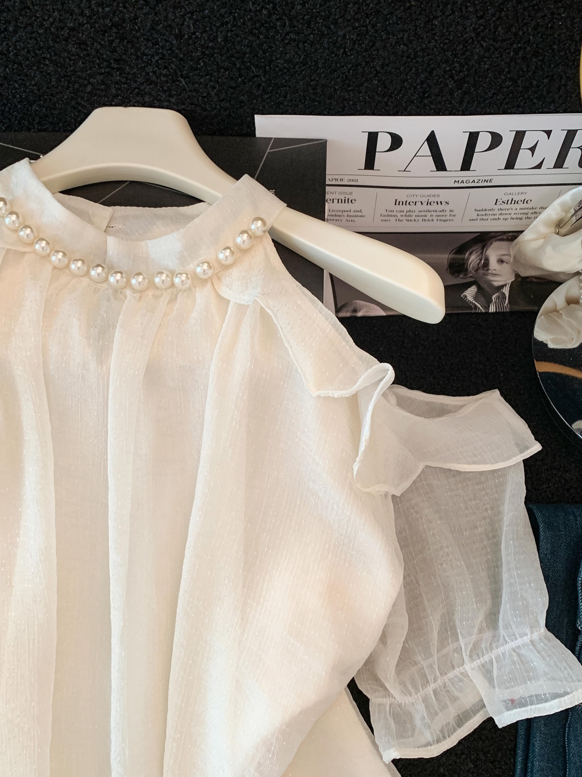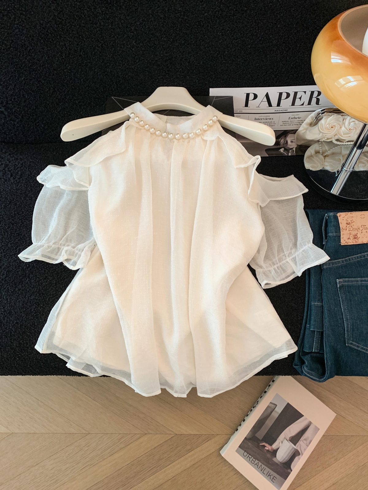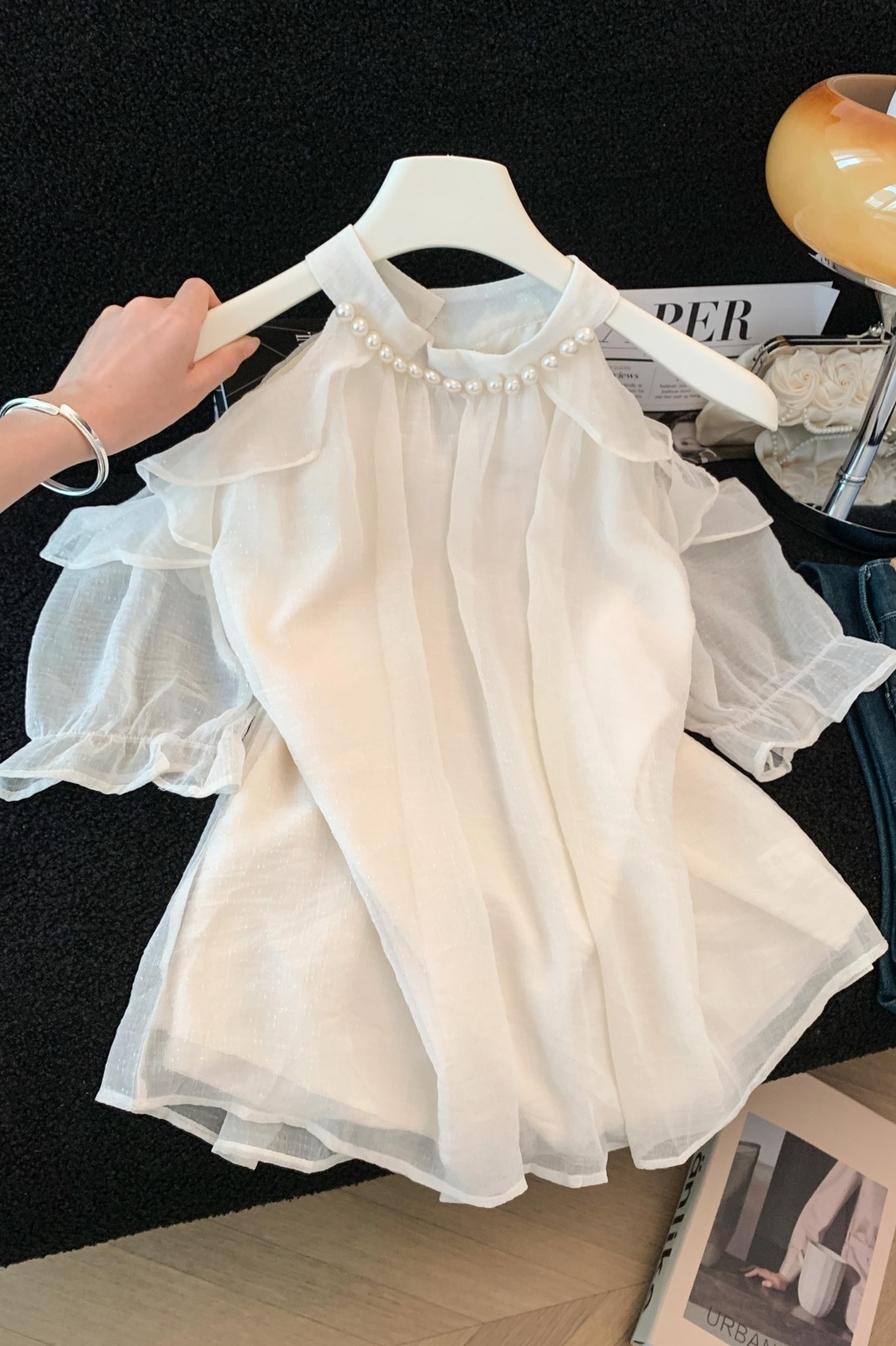 실사 단색 행침 목 오프숄더 시폰 셔츠 여성 여름 얇은 스타일 프랑스식 품격 우아함 디자인 센스 맨위
