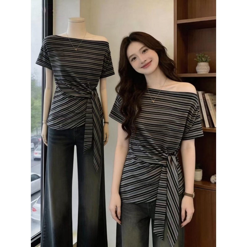 빅 사이즈 한 부서 스트라이프 긍정적 인 어깨 반팔 티셔츠 여성 여름 디자인 센스 동정 지방 mm 루즈핏 슬림해 보이는 맨위