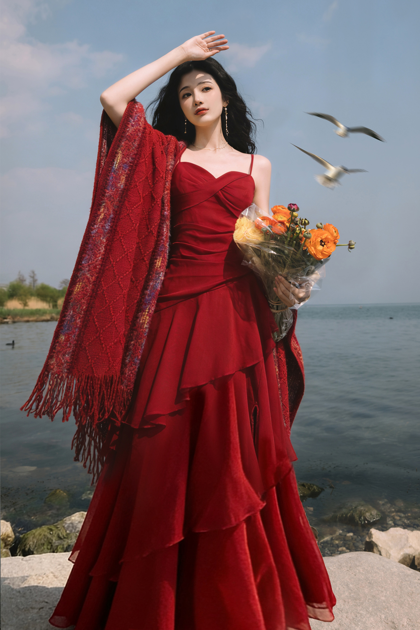 언어 그리스어 진짜 사진 찍기 새로운 빨간색 불규칙 케이크 트임 슬립 드레스 코디 후드 숄 투피스 세트 휴가 치마