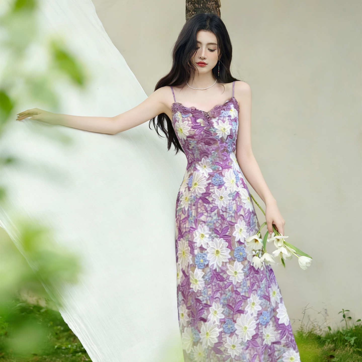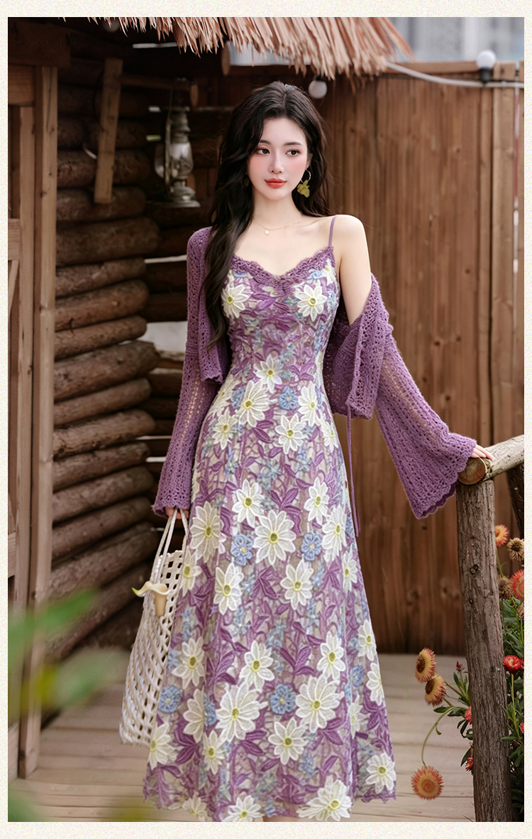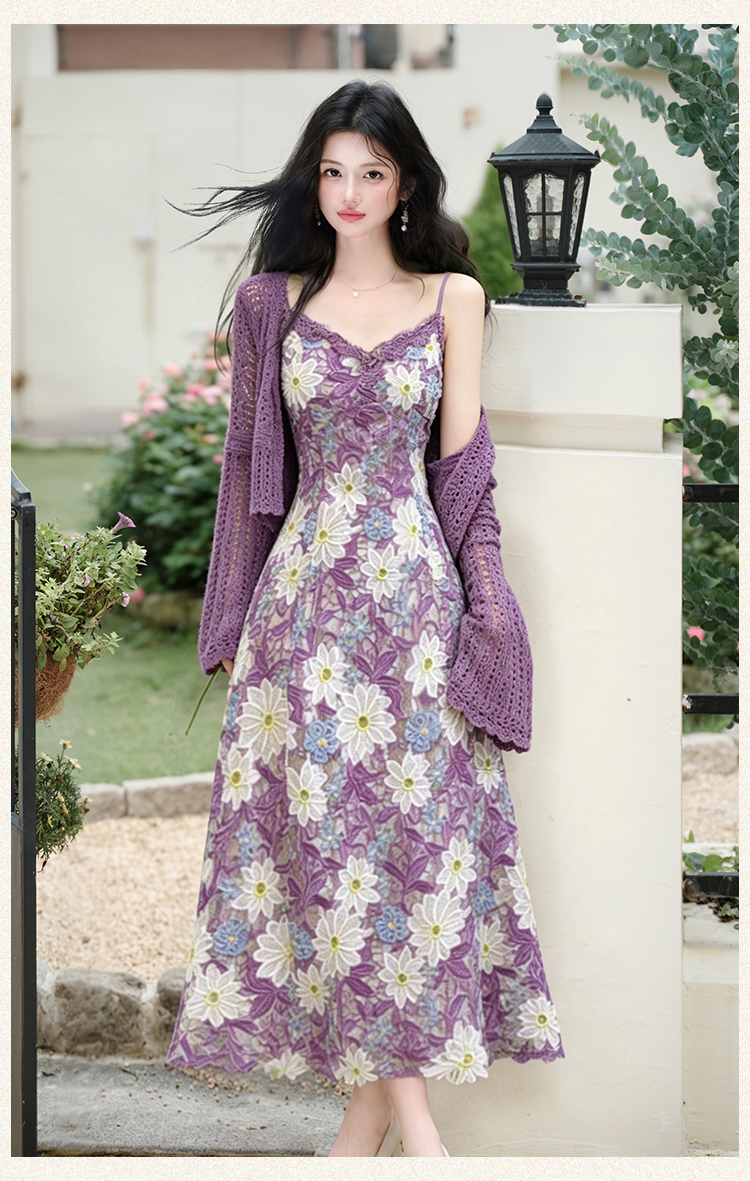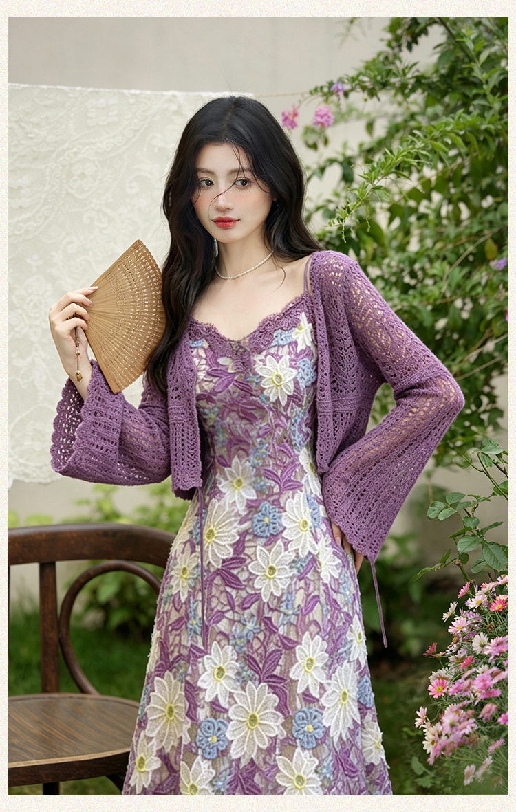 언어 그리스어 진짜 사진 찍기 새로운 고급 센스 자수 레이스 슬립 드레스 코디 보라색 재킷 투피스 세트