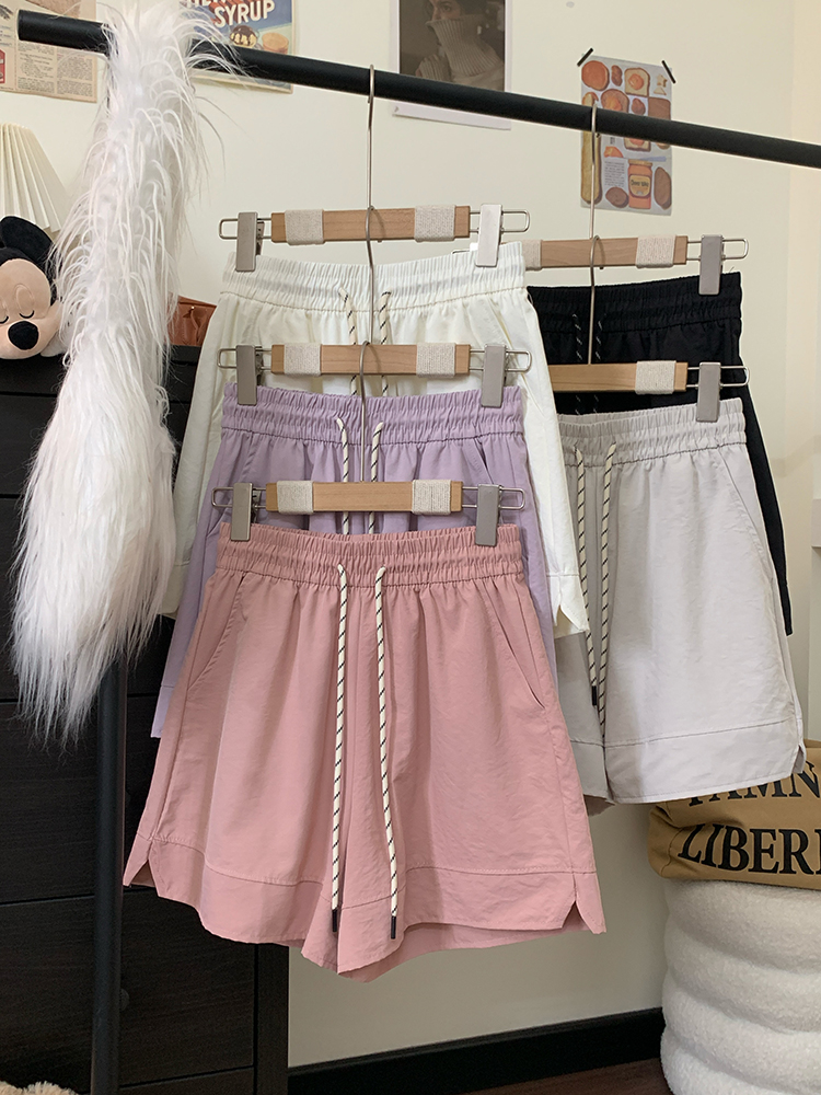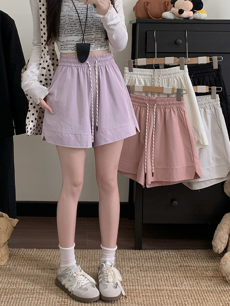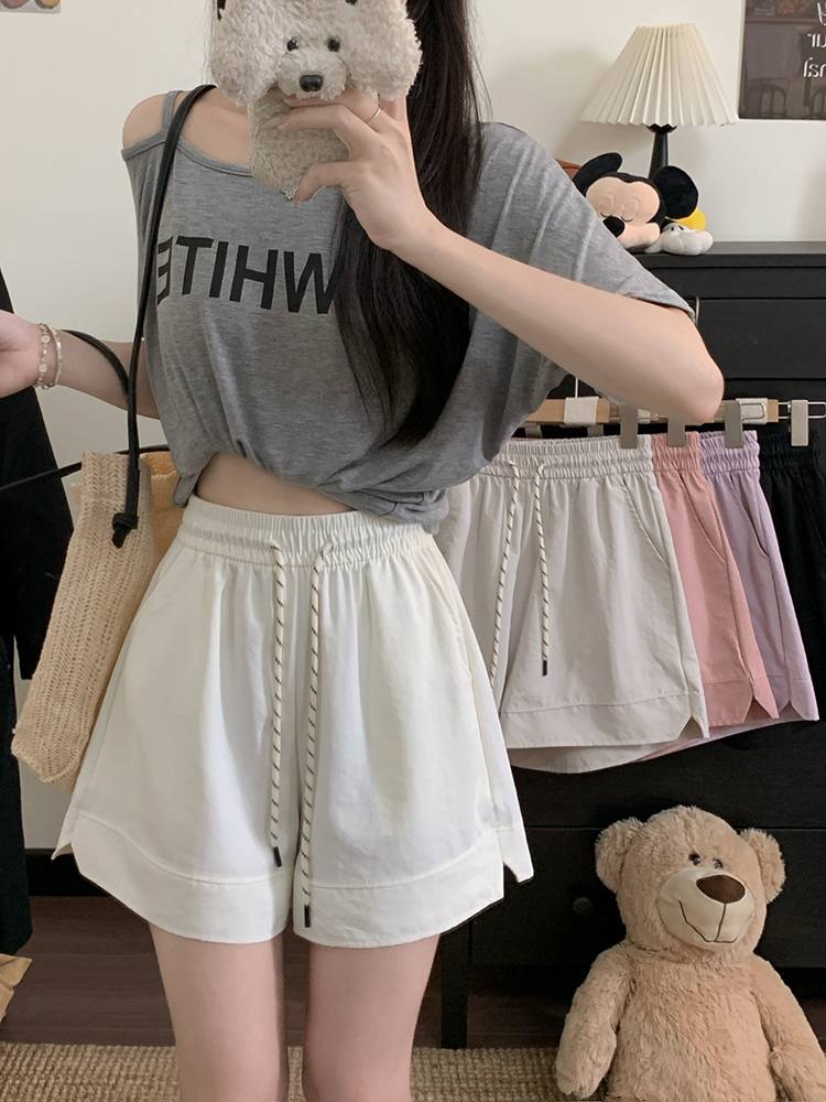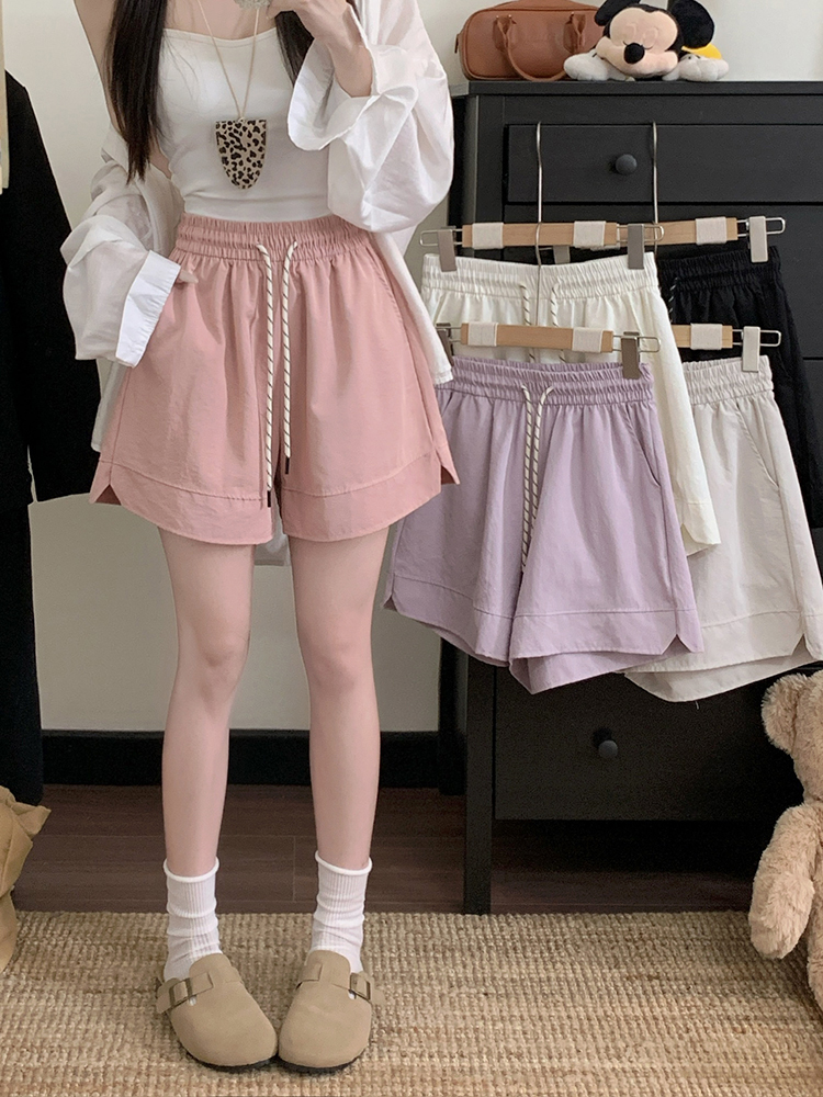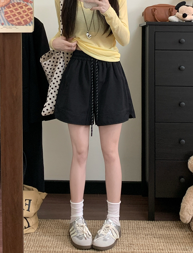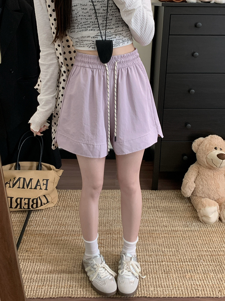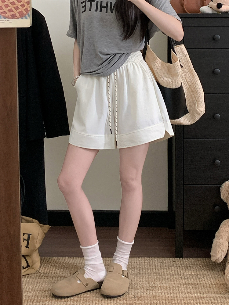 실사 2026 여름 새로운 허리밴드 펌프 로프 반바지 슬림해 보이는 와이드 레그 팬츠 단색 캐주얼 바지 여성