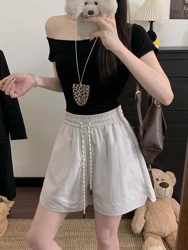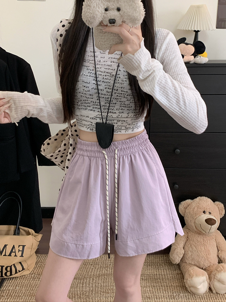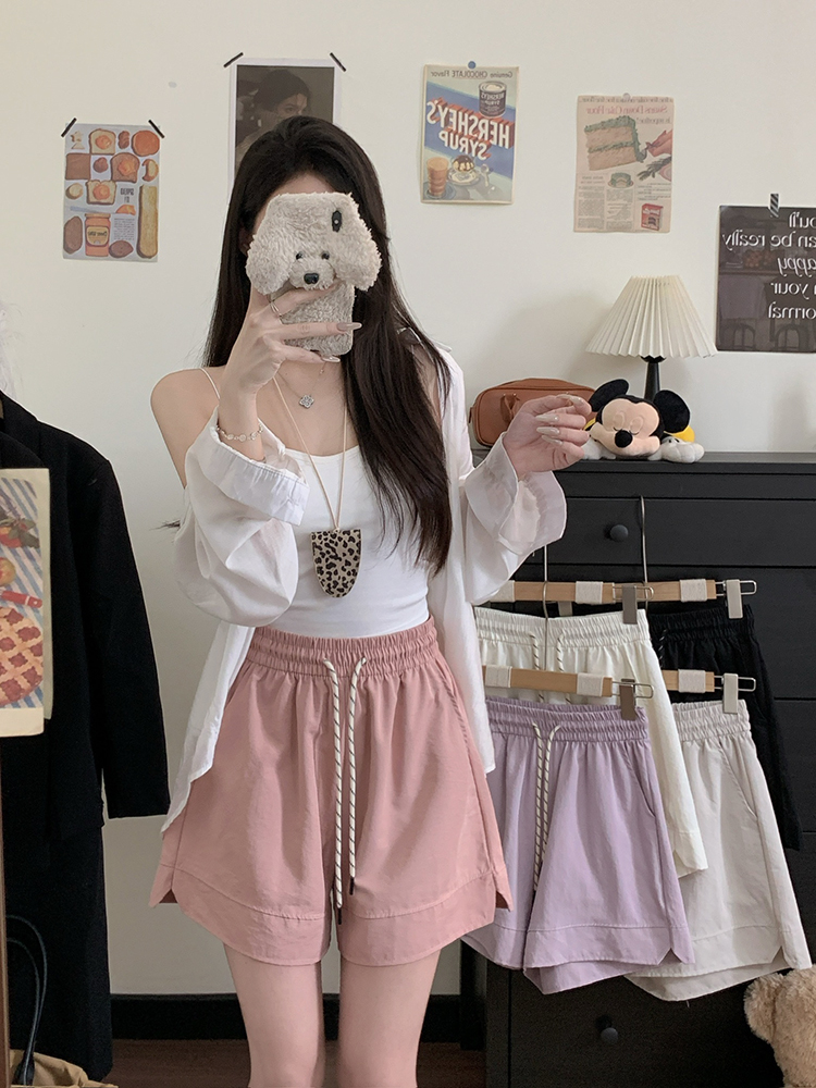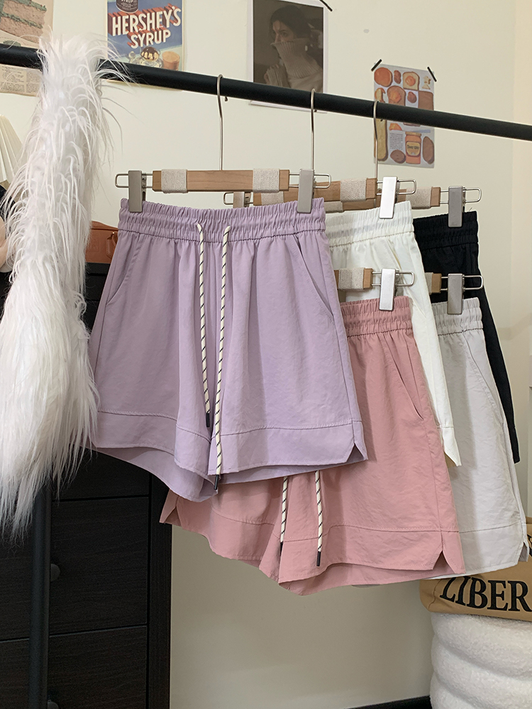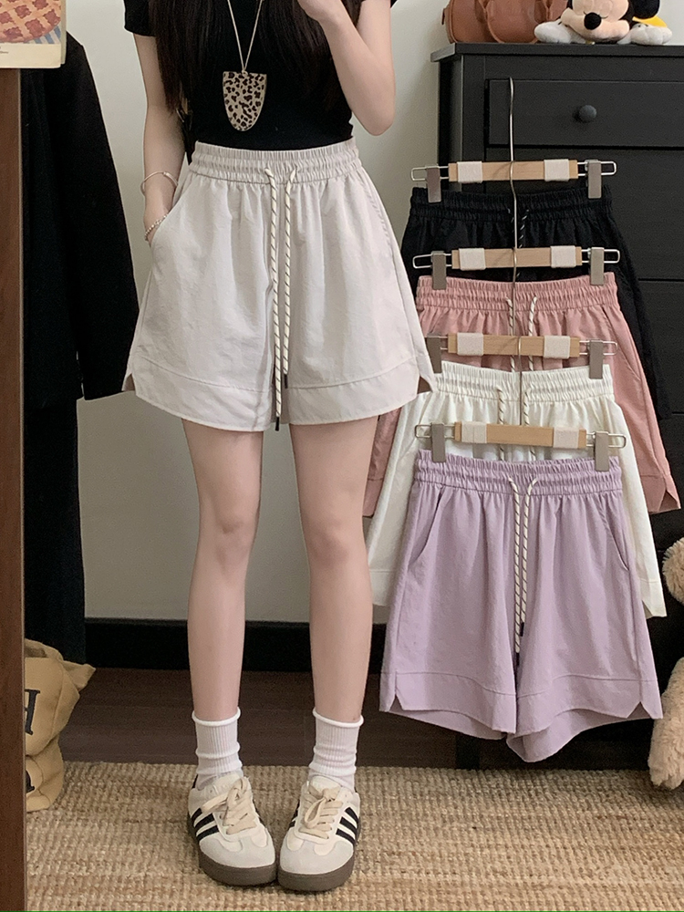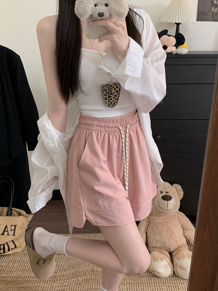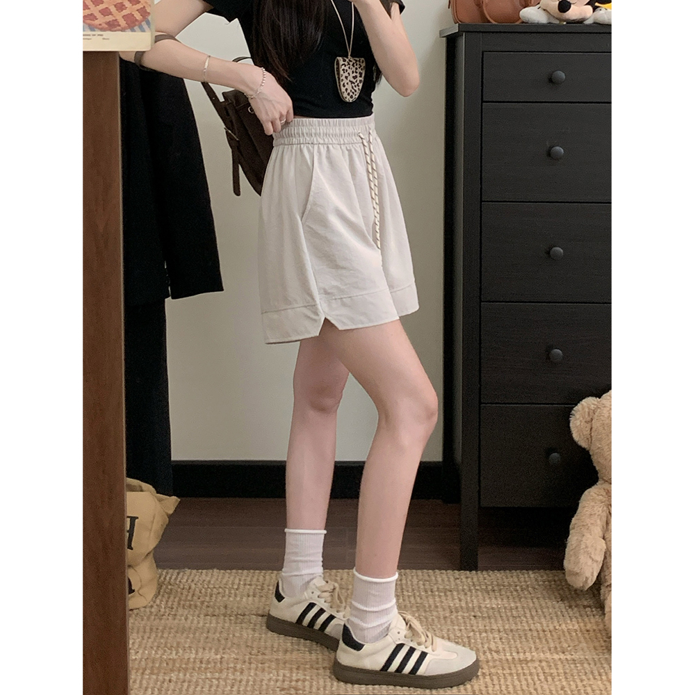 실사 2026 여름 새로운 허리밴드 펌프 로프 반바지 슬림해 보이는 와이드 레그 팬츠 단색 캐주얼 바지 여성