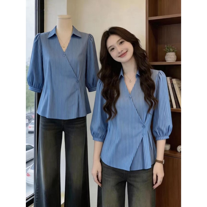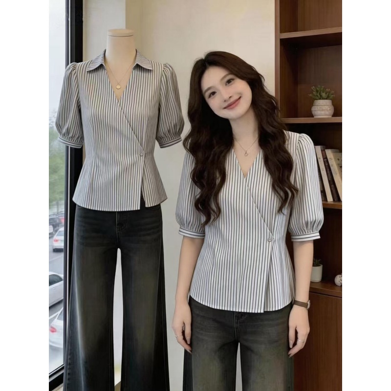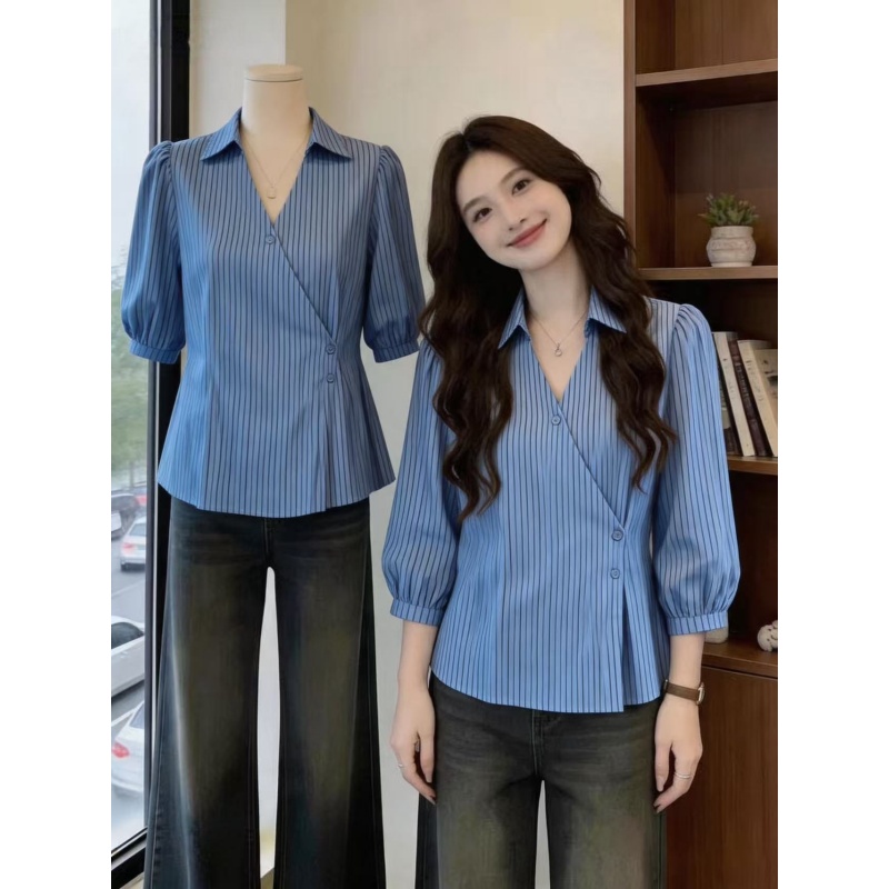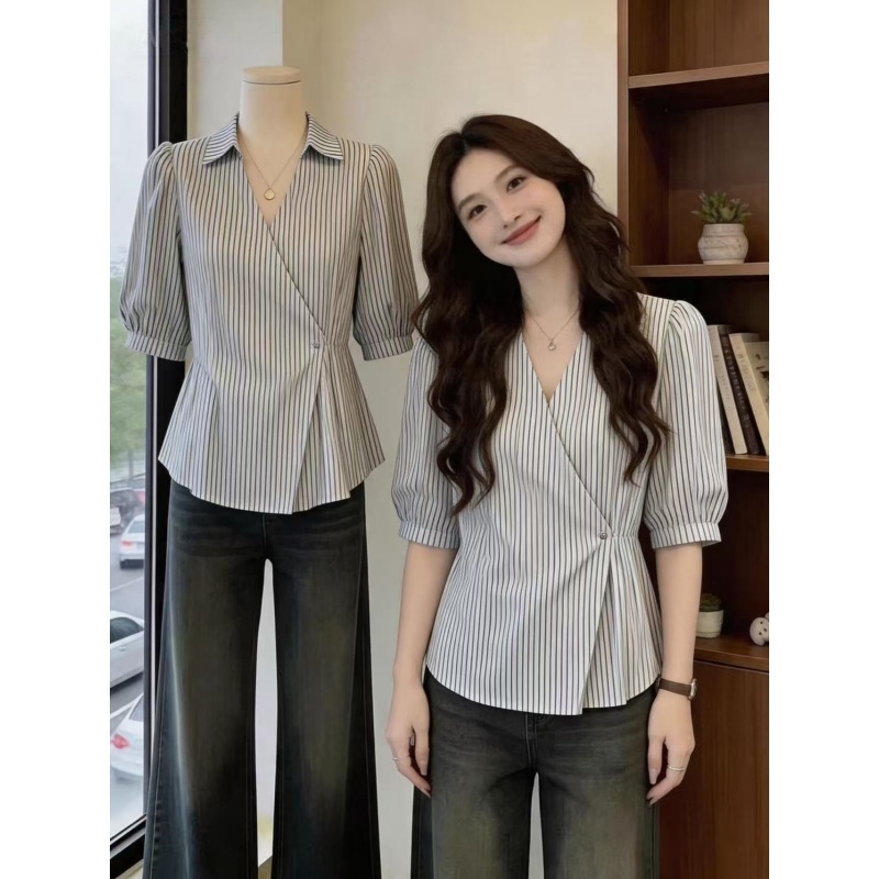 빅 사이즈 여성 의류 스트라이프 V넥 반팔 만나는 여성 셔츠 여름 지방 mm 레이스업 허리 수축 중간 길이 표지 배 맨위