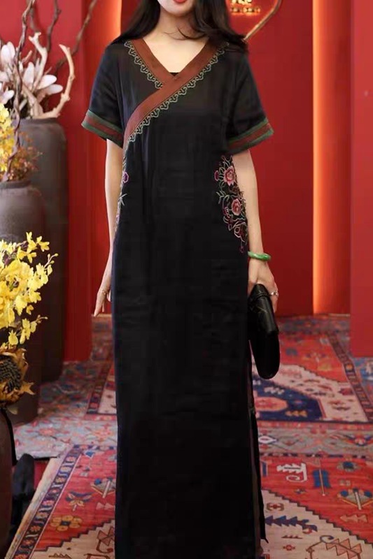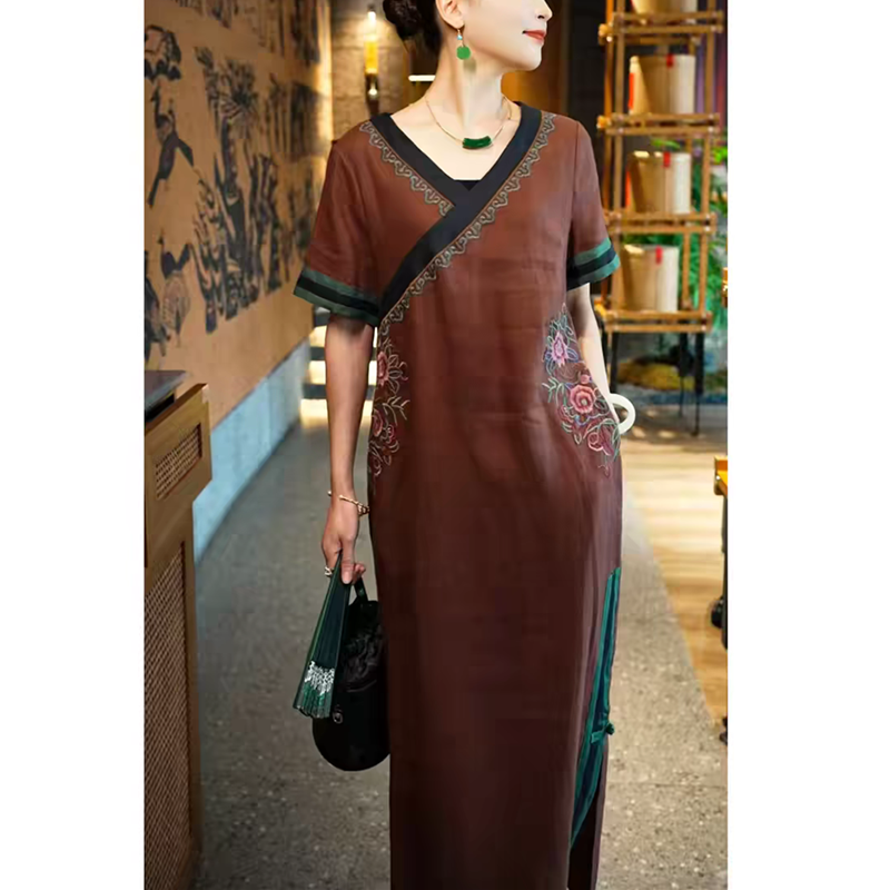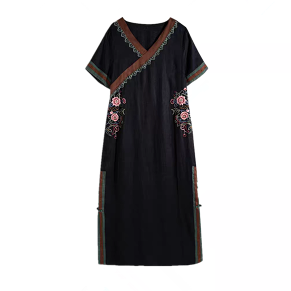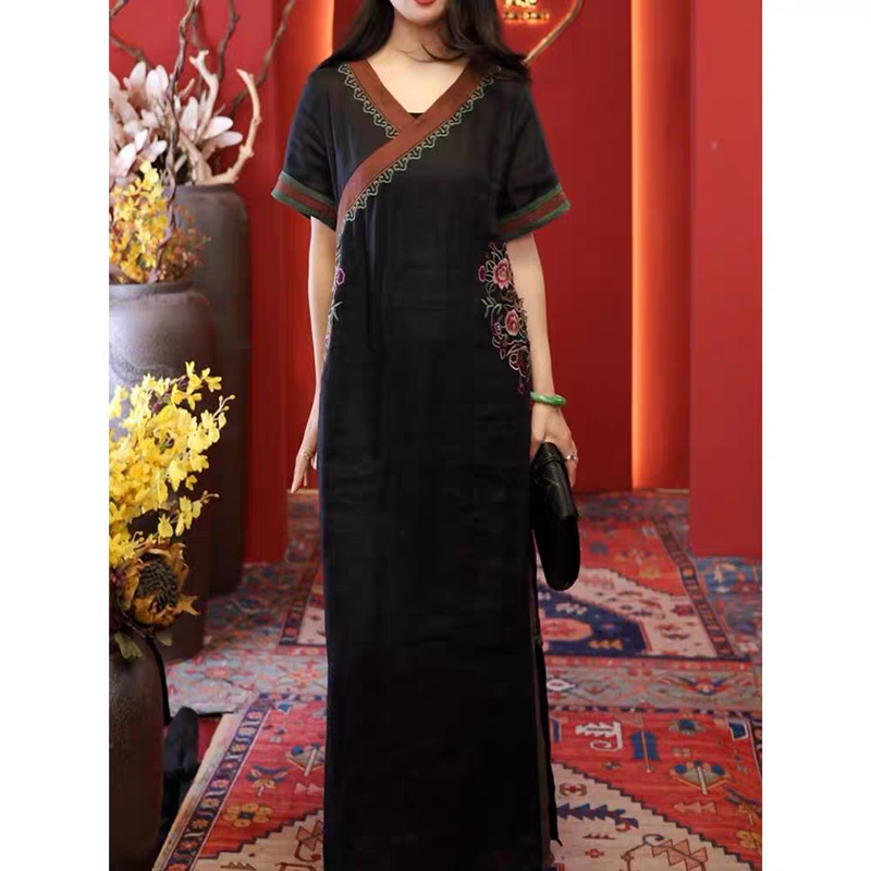 민족 스타일 무거운 작업 자수 면 린넨 드레스 2026 여름 새로운 V넥 슬림해 보이는 레트로 우아함 품격 롱 스커트