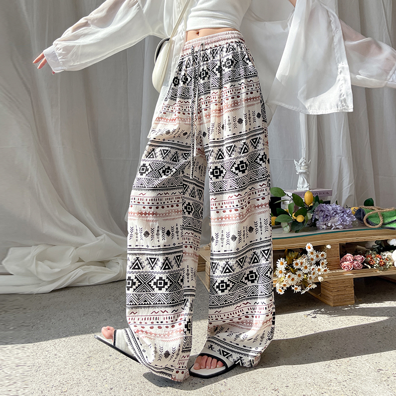 실사 2026 여름 새로운 아세트산 얼음 실크 프린트 와이드 레그 팬츠 새틴 스트레이트 새로운 중식 캐주얼 바지 아이들