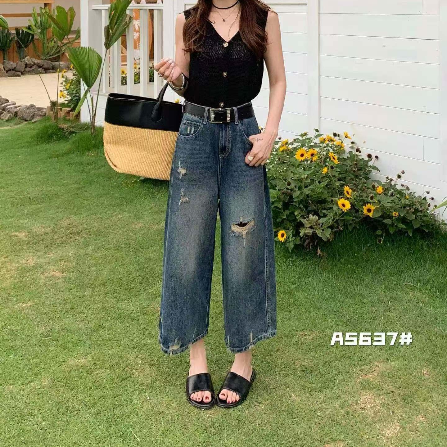jeans A 어디서? 암소 5637 여름 섹션 하이웨이스트 슬림해 보이는 다용도 루즈핏 찢어진 부분 7 점 와이드 레깅스 바지 데님 바지