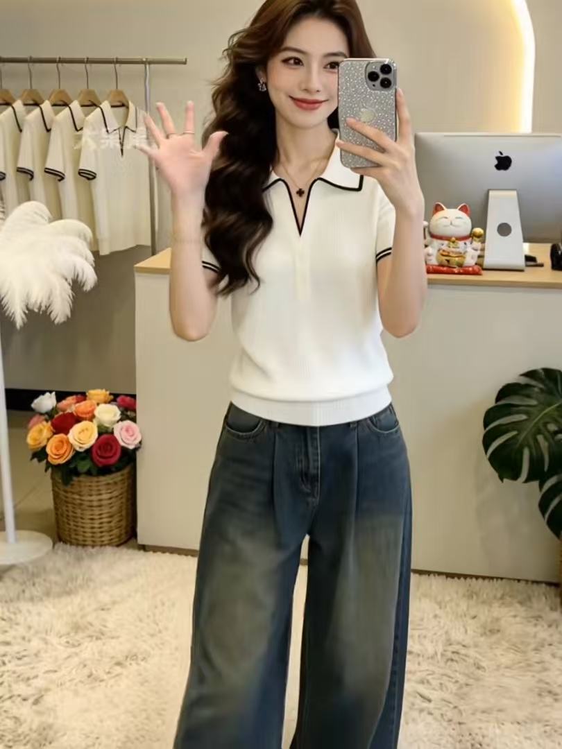 프랑스식 폴로 칼라 배색 고급 반팔 니트 스웨터 여성 여름 빅 사이즈 지방 mm 표지 배 슬림해 보이는 긍정적 인 어깨 V넥 맨위