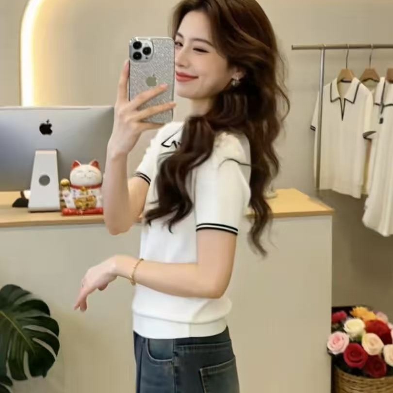 한 부서 자수 홀로우 아웃 폴로 칼라 얼음 실크 니트 반팔 여성 여름 외출용 고급 센스 슬림해 보이는 POLO 셔츠 미니멀리즘 맨위