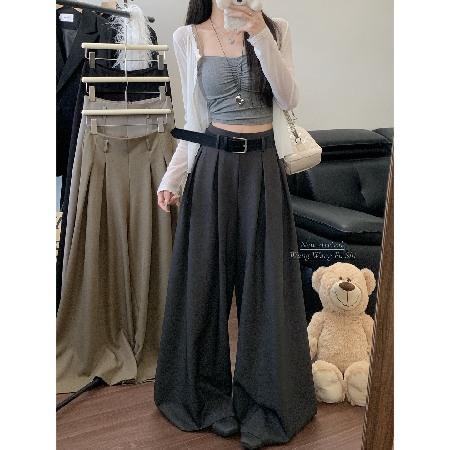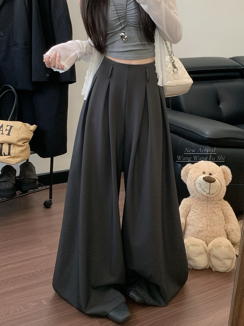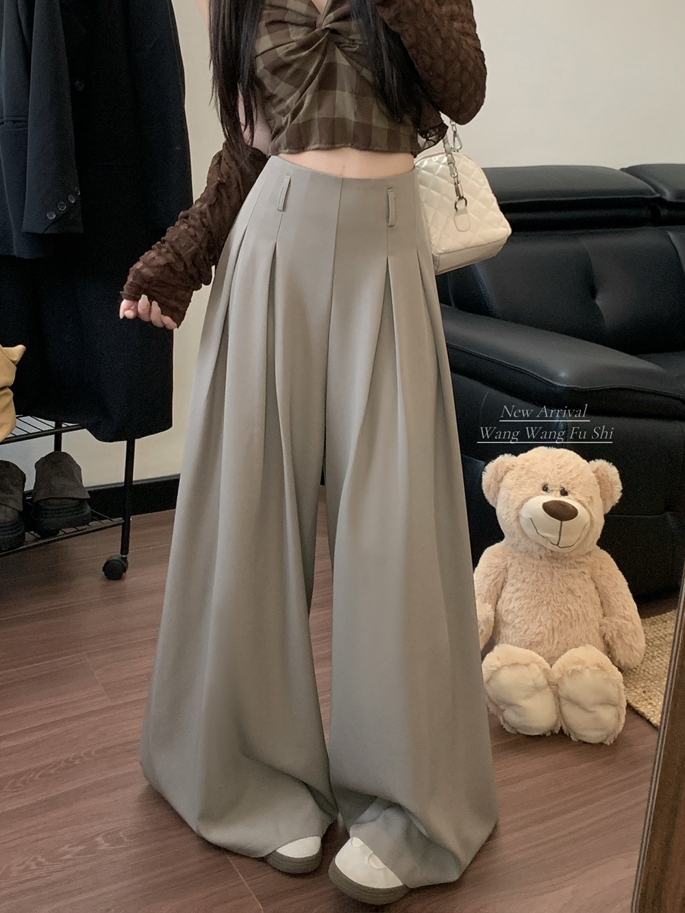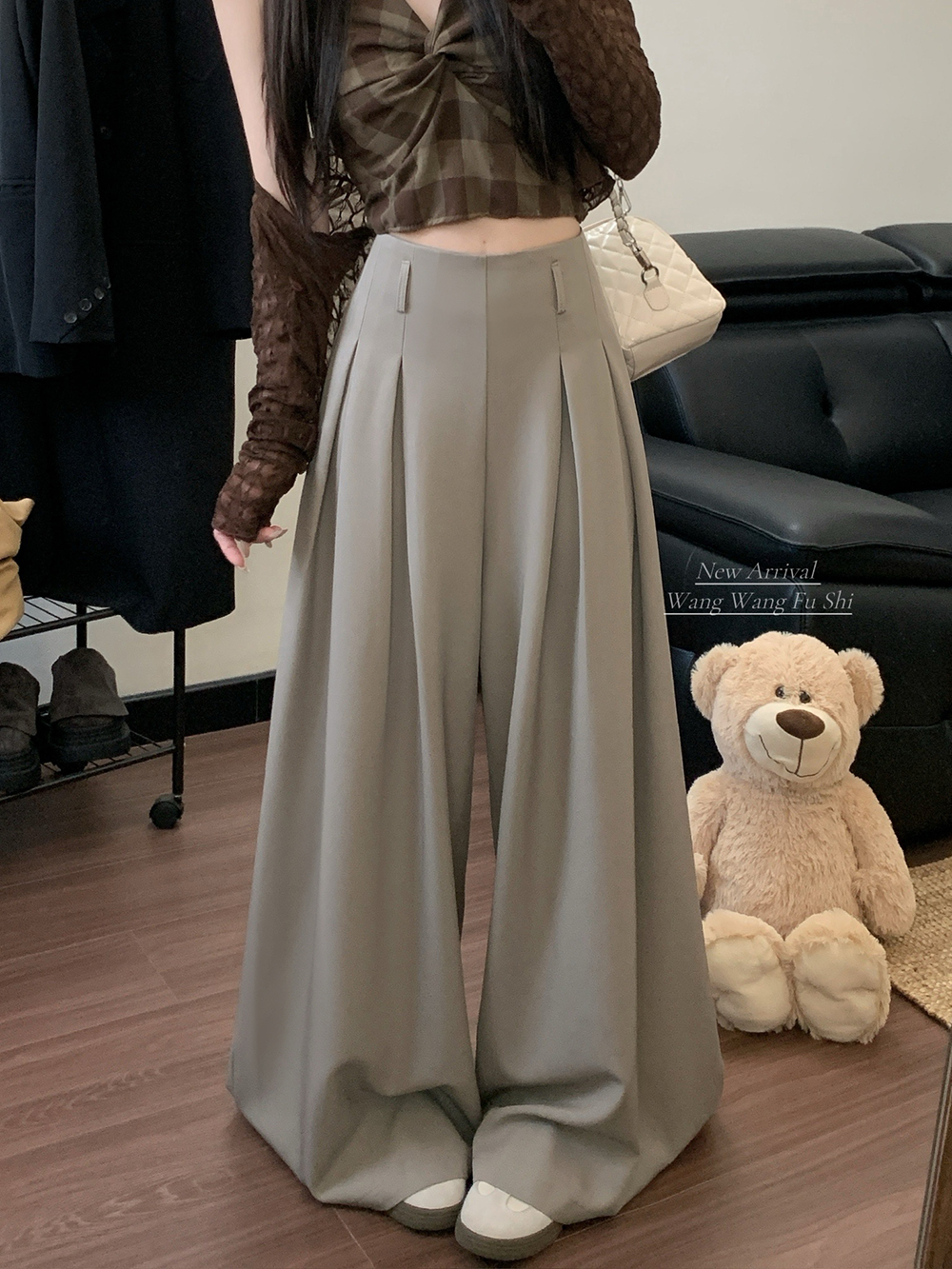 실사 2026 루즈핏 디자인 센스 정장 바지 캐주얼 바지 여성 와이드 레그 팬츠 하이웨이스트 도루 센스 바닥 청소 바지