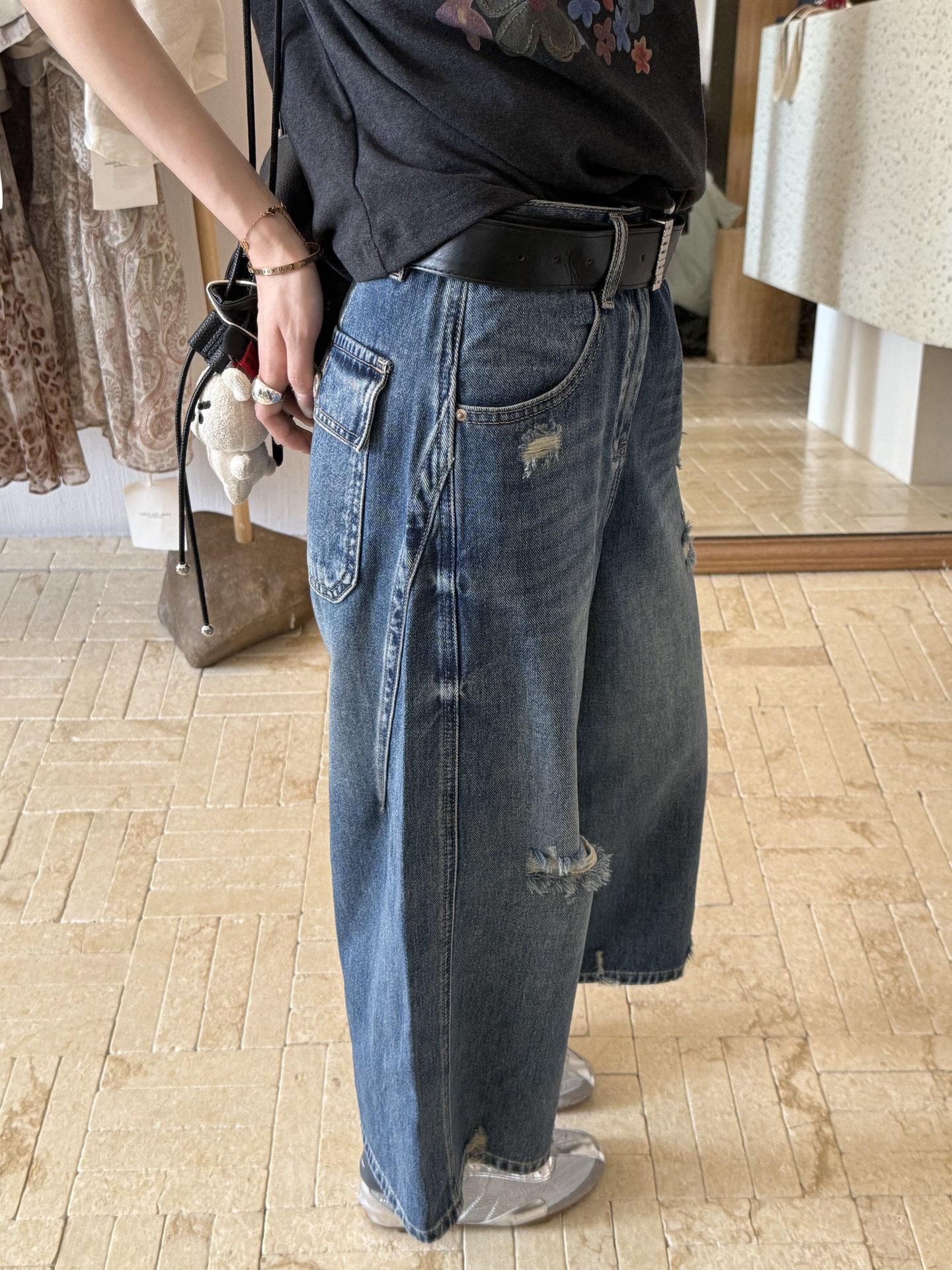 素心 블루 youmo 2026 여름 드레스 레트로 마 오래된 착용 찢어진 부분 캐주얼 8 점 와이드 레그 팬츠 청바지 여성
