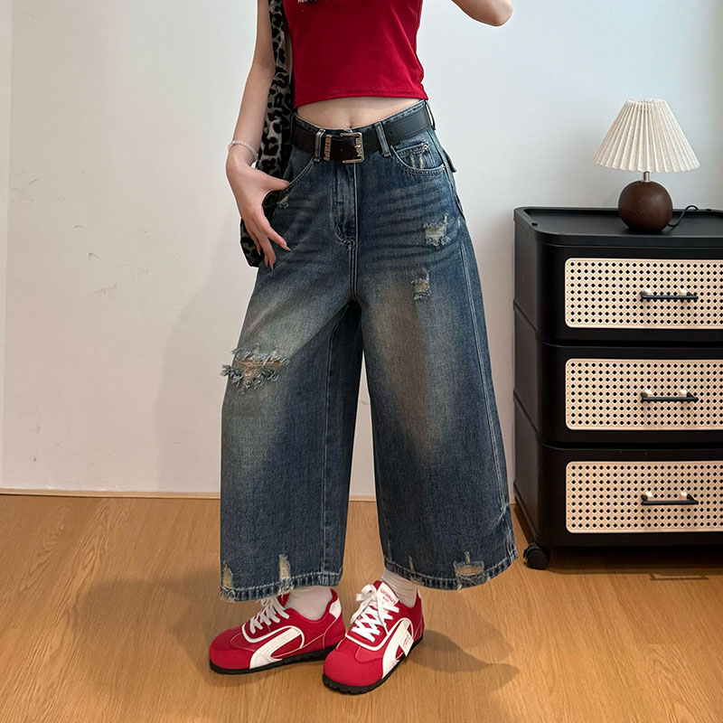 아메리칸 레트로 작은 대중 파란색 찢어진 부분 8 점 청바지 여성 2026 여름 새로운 다용도 루즈핏 와이드 레그 팬츠