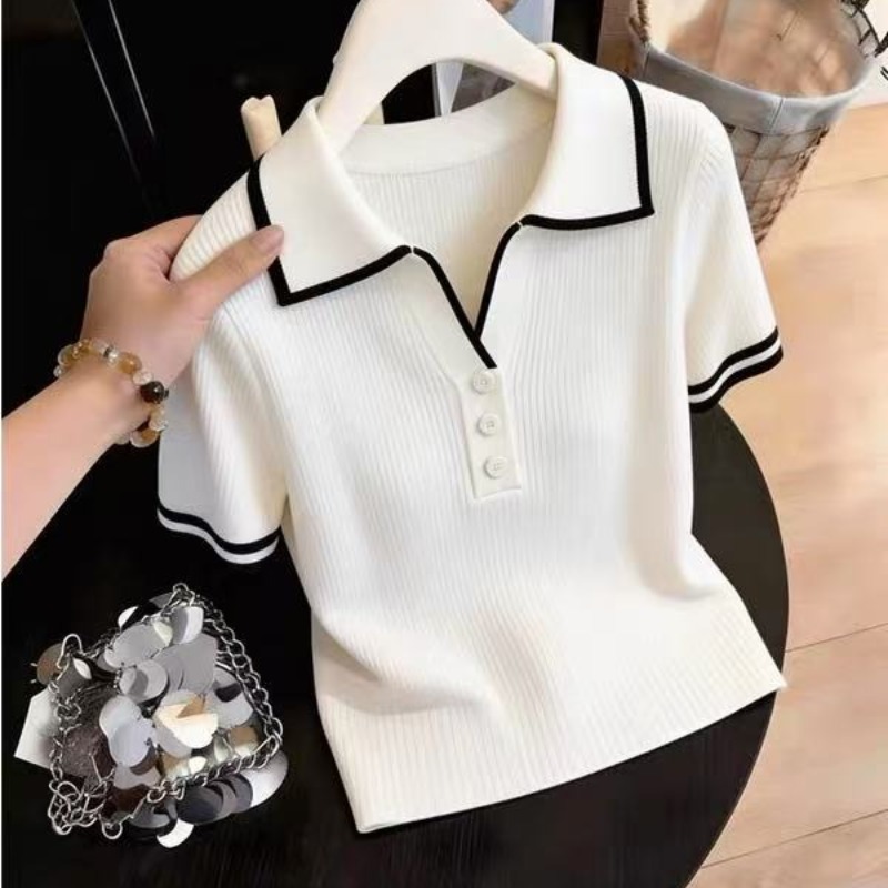 한 부서 부드러운 배색 POLO 칼라 반팔 티셔츠 여성 여름 새로운 올해 인기 품격 얼음 실크 니트 맨위