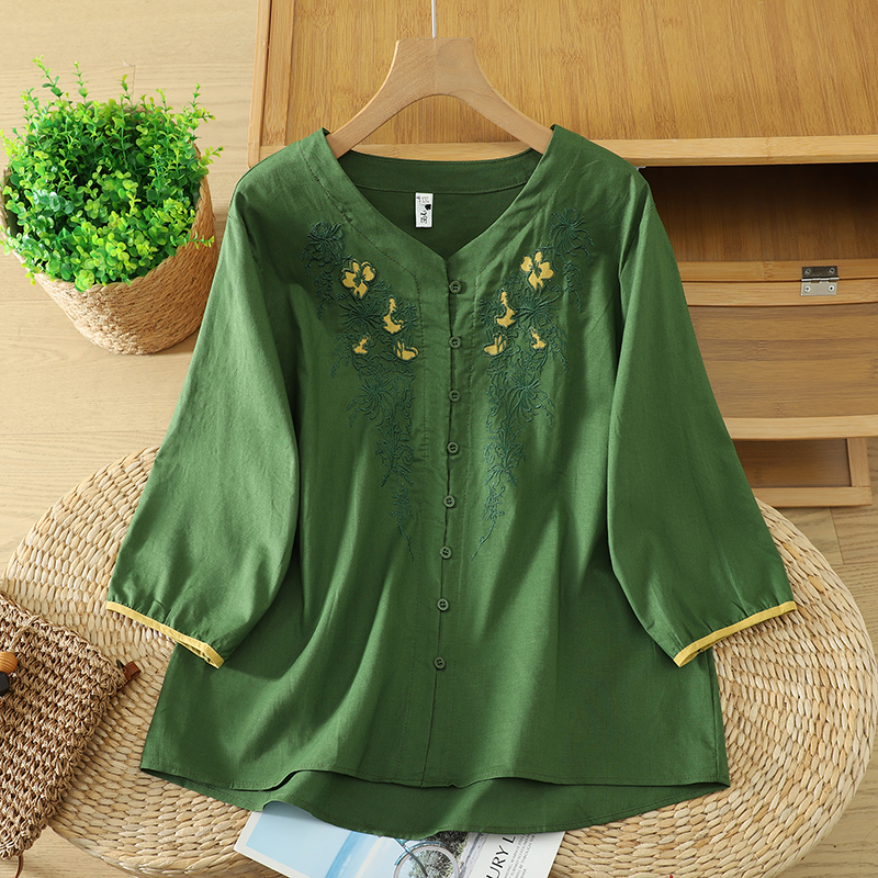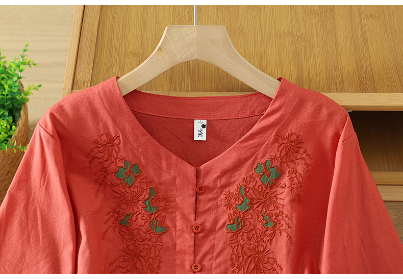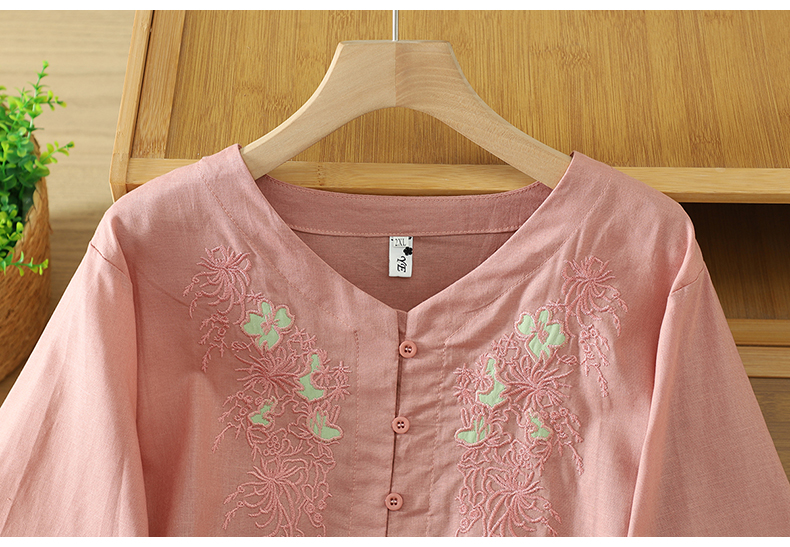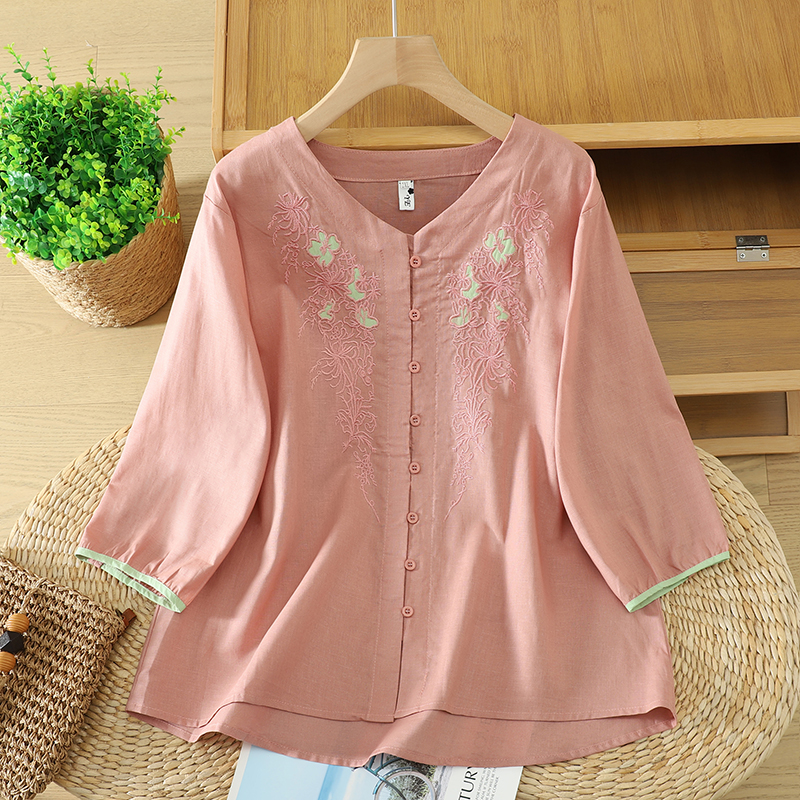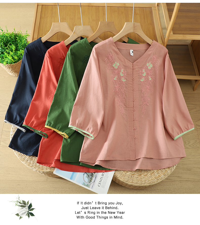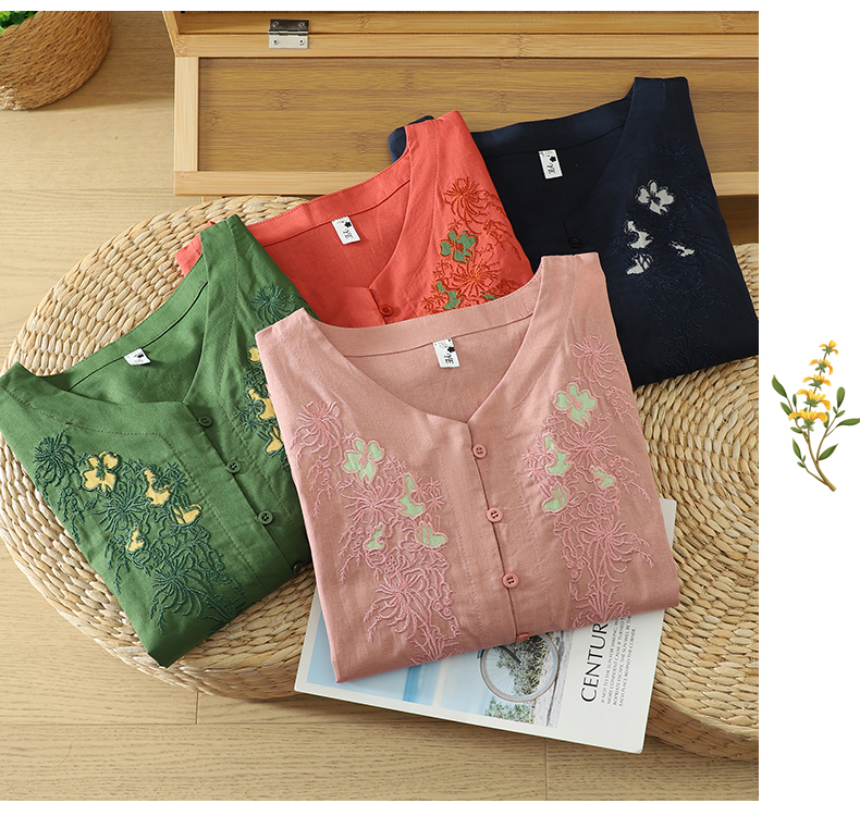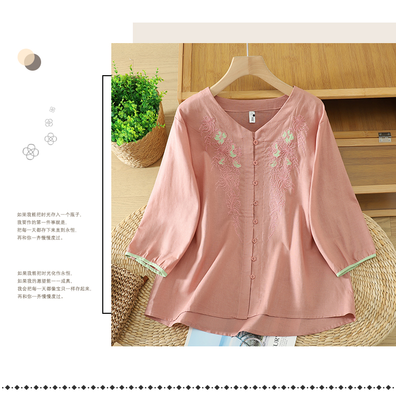 실사 5 점 소매 한국 스타일 빅 사이즈 표지 고기 슬림해 보이는 레트로 자수 외국 가스 세련된 면 린넨 셔츠 2026 새로운 여성