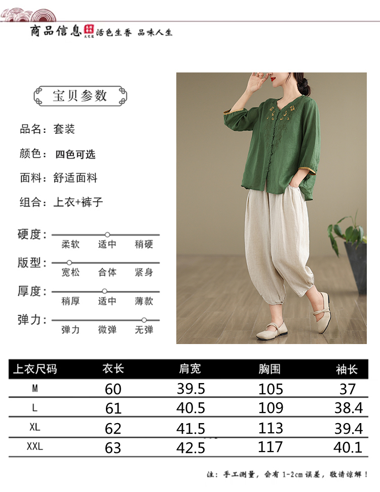 실사 2026 여름 작은 키 루즈핏 슬림해 보이는 면 린넨 중식 자카드 맨위 캐주얼 하렘 바지 세트 여성
