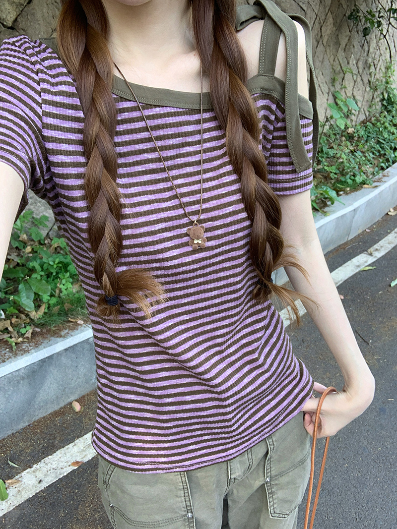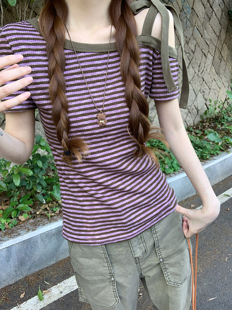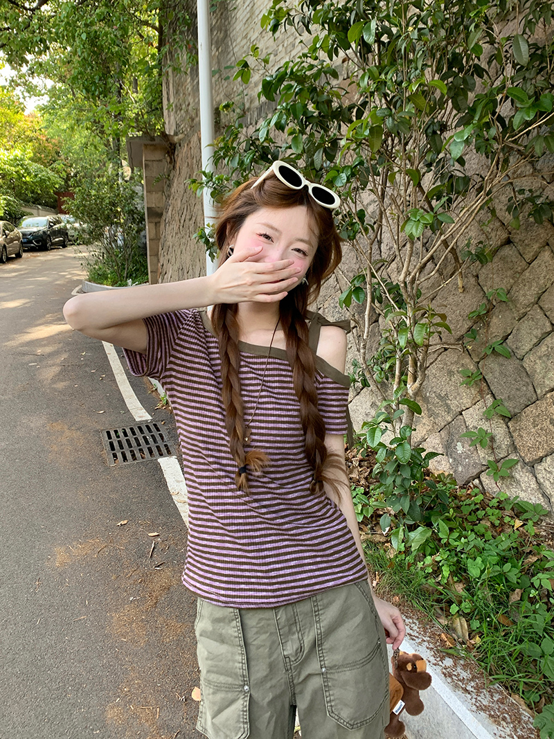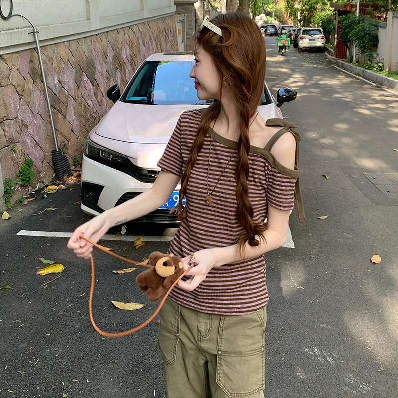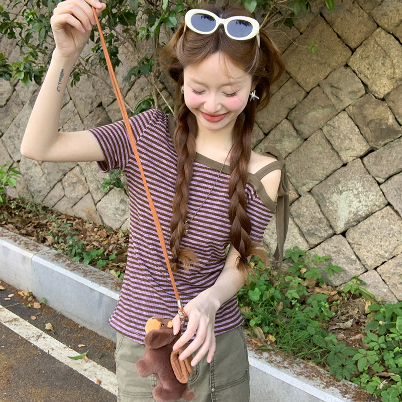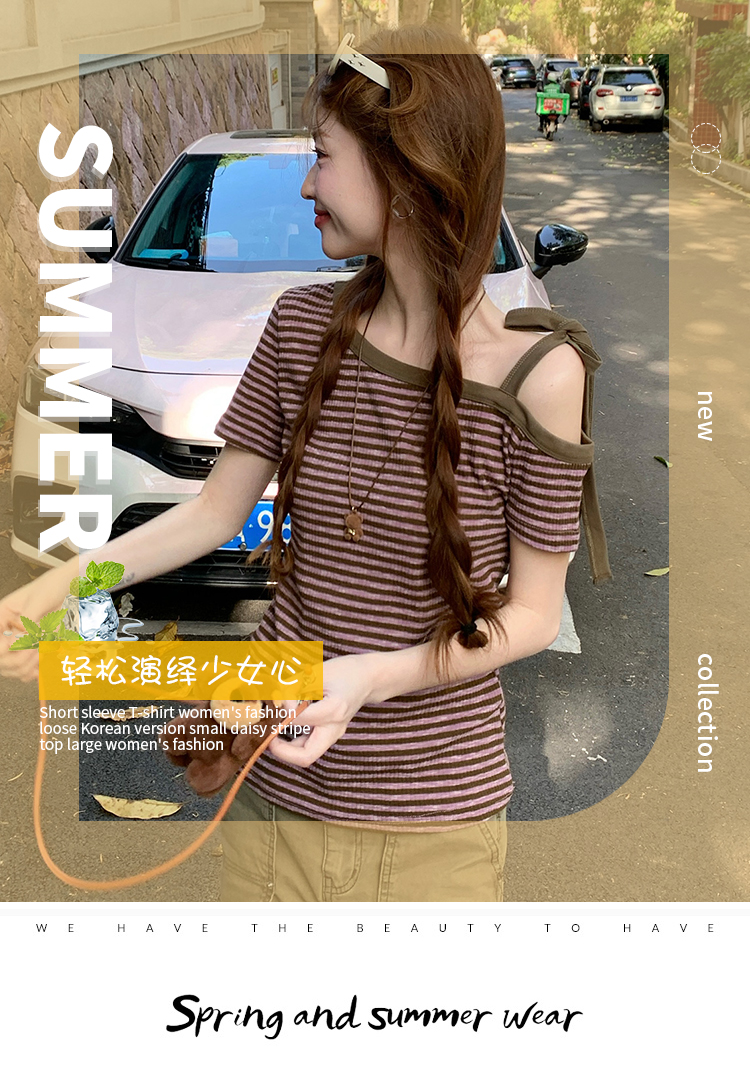 실사 반팔 티셔츠 여름 2026 새로운 트렌디 비스듬한 어깨 스트랩 레트로 스트라이프 몸매 가꾸기 쇼트 스타일 라운드 넥 맨위 여성 의류