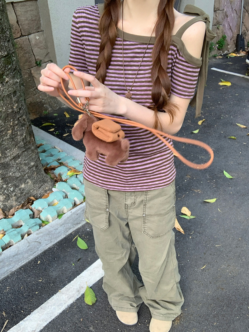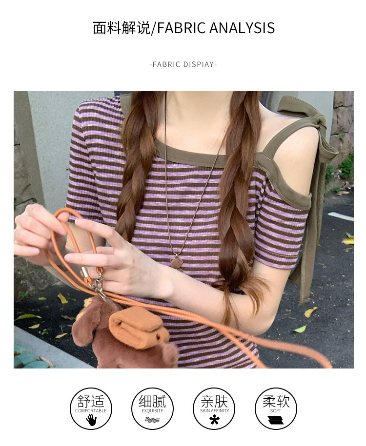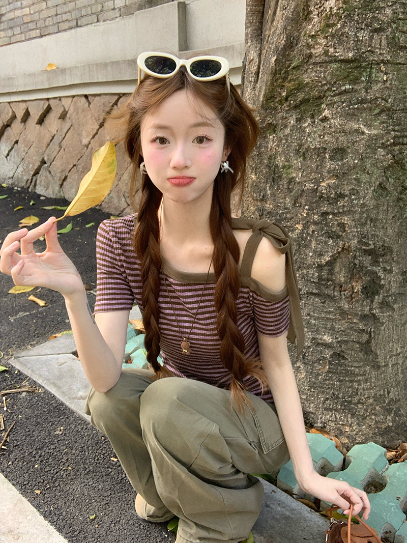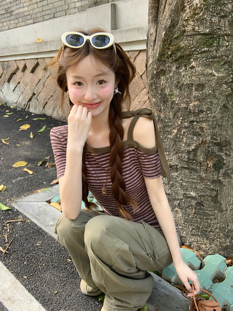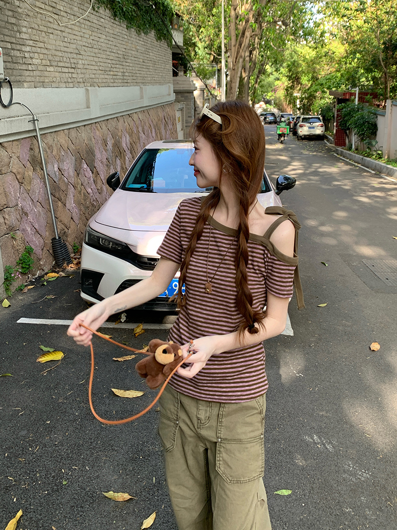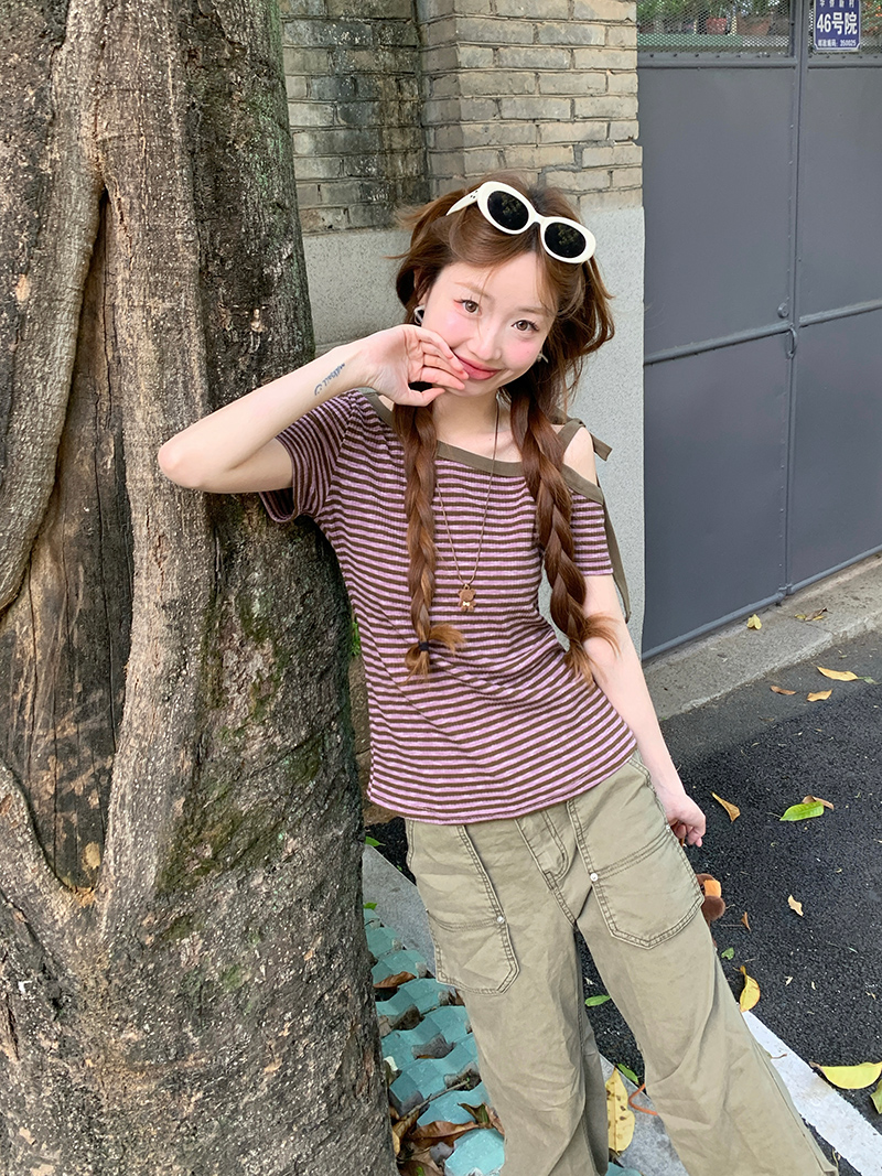 실사 반팔 티셔츠 여름 2026 새로운 트렌디 비스듬한 어깨 스트랩 레트로 스트라이프 몸매 가꾸기 쇼트 스타일 라운드 넥 맨위 여성 의류