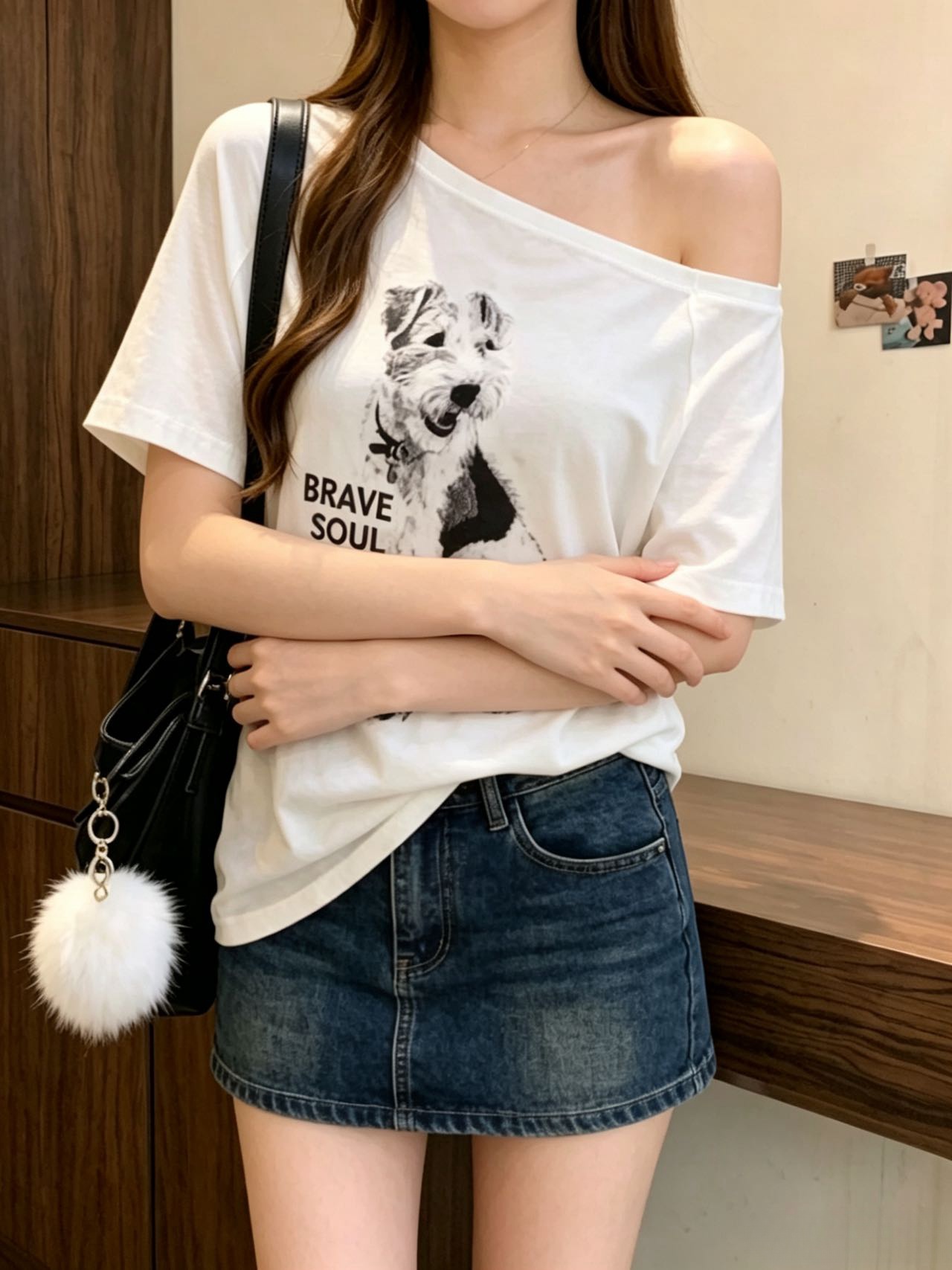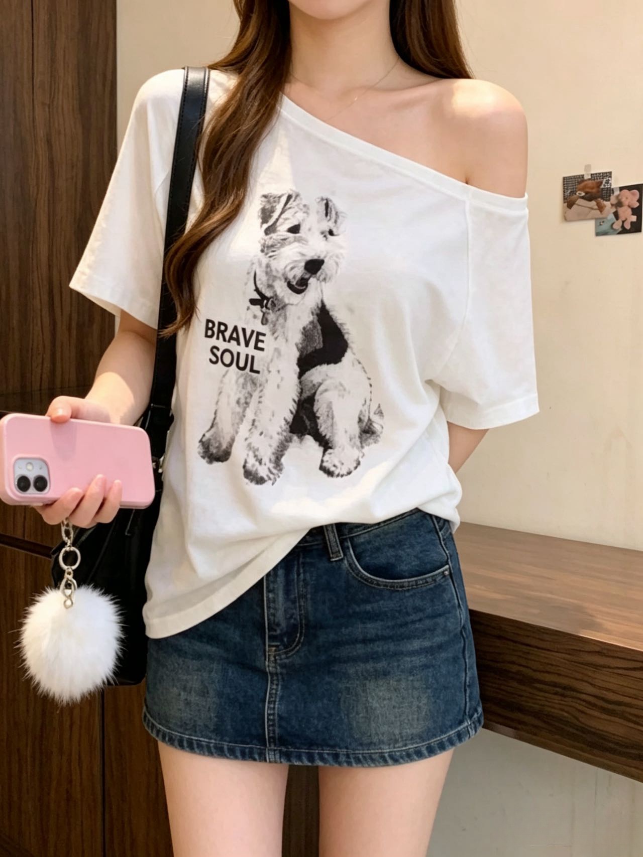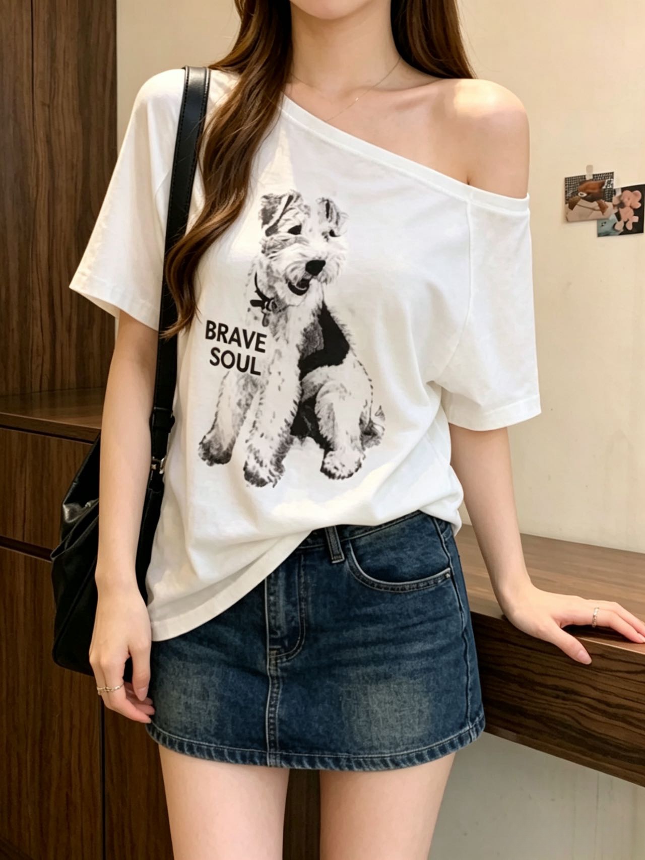 화이트 귀여운 개 비스듬한 어깨 반팔 티셔츠 여성 여름 새로운 루즈핏 느긋한 센스 오프숄더 슬림해 보이는 맨위
