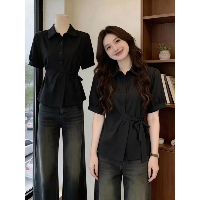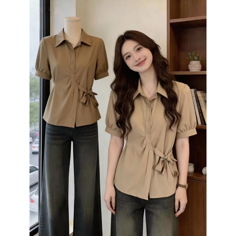 빅 사이즈 여성 의류 벨트 포함 허리 수축 깊은 V 넥 반팔 여성 셔츠 2026 여름 품격 루즈핏 슬림해 보이는 셔츠 맨위
